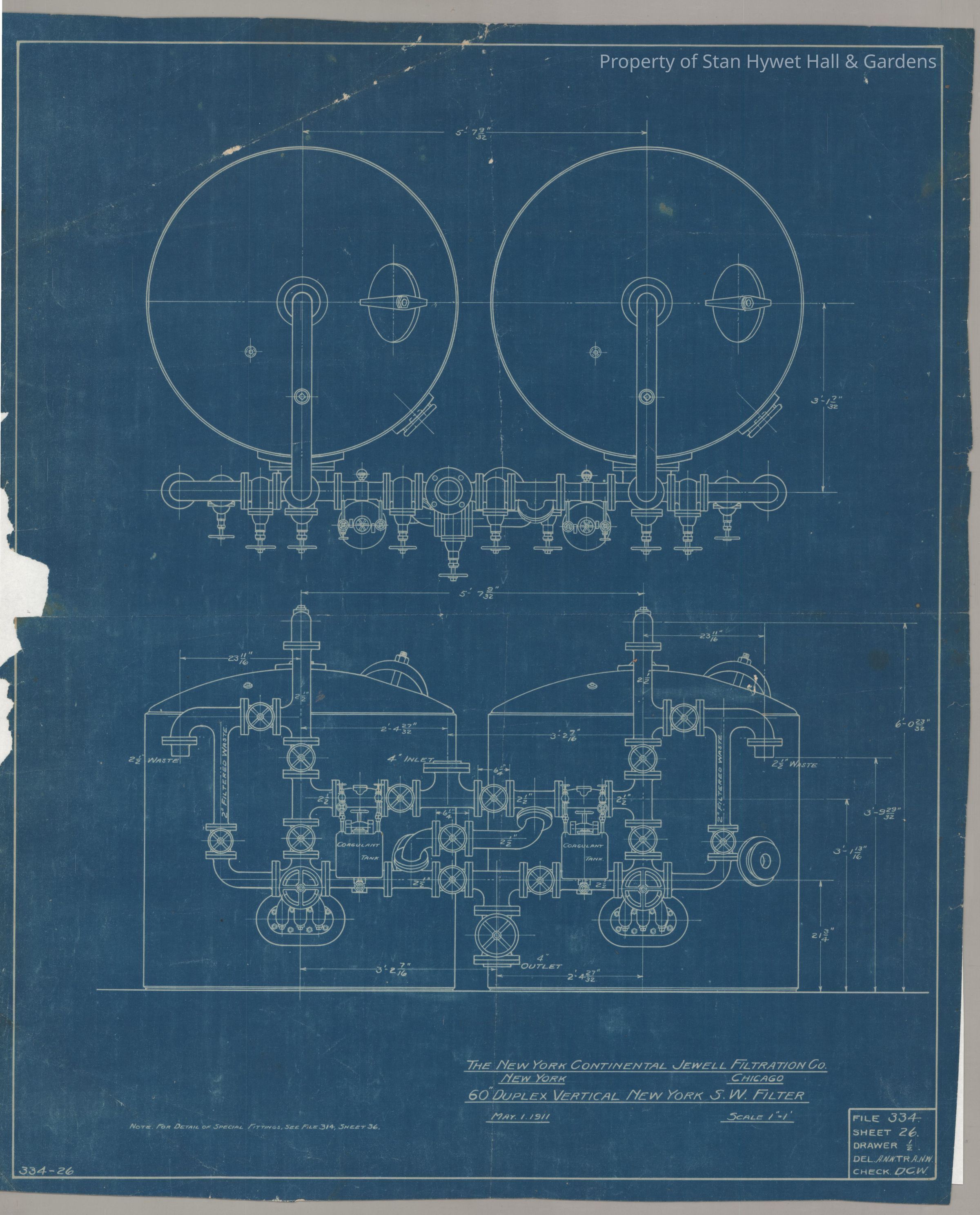 Historic blueprint: Details and sections of sand filtration in Filter Room. Titled "The New York Continental Jewell Filtration Co. 60" Duplex vertical New York S.W. Filter". (S.W. stands for sectional wash)