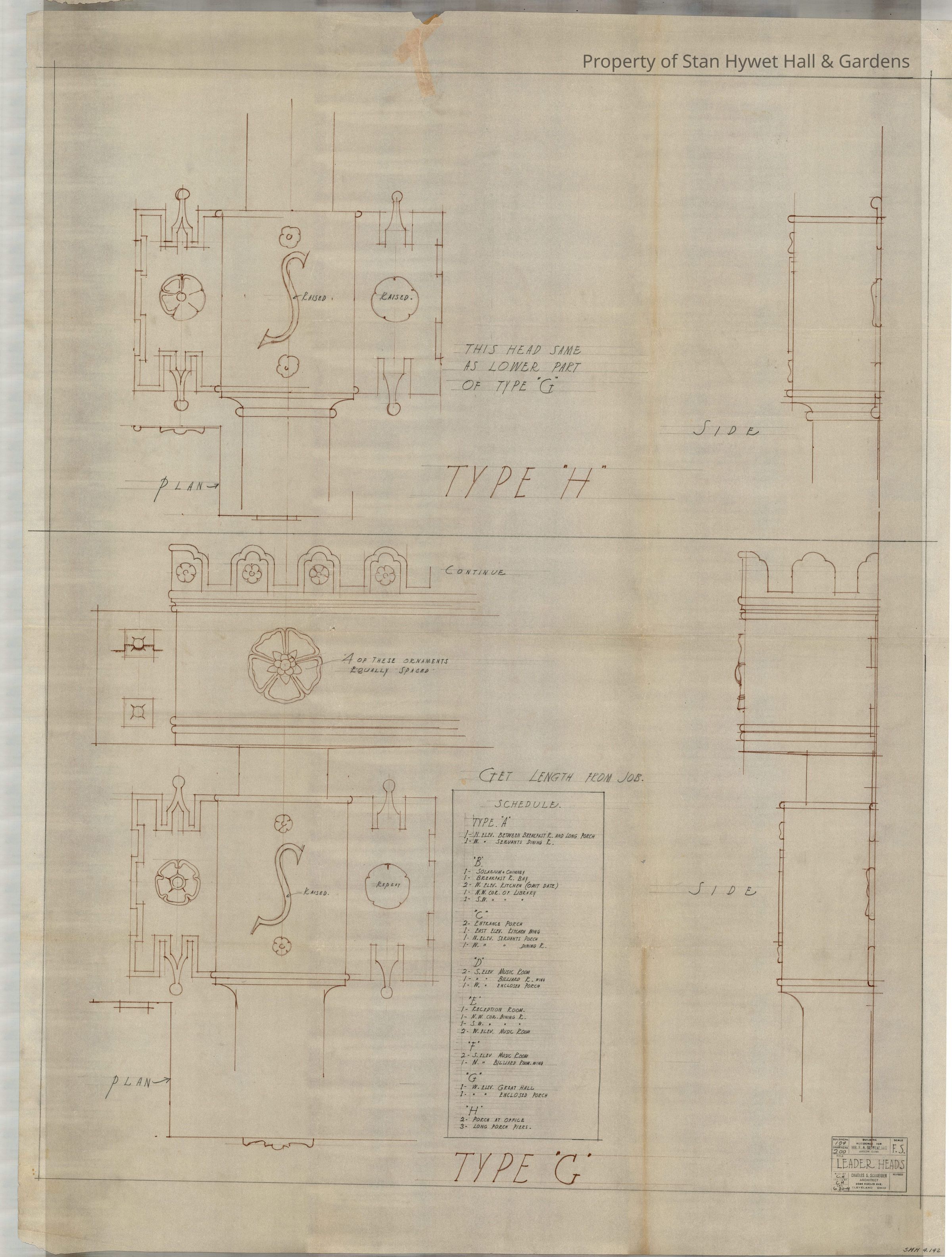 Historic drawing: Full sized details of outdoor Leader Heads details showing Type "G", and Type "H".
