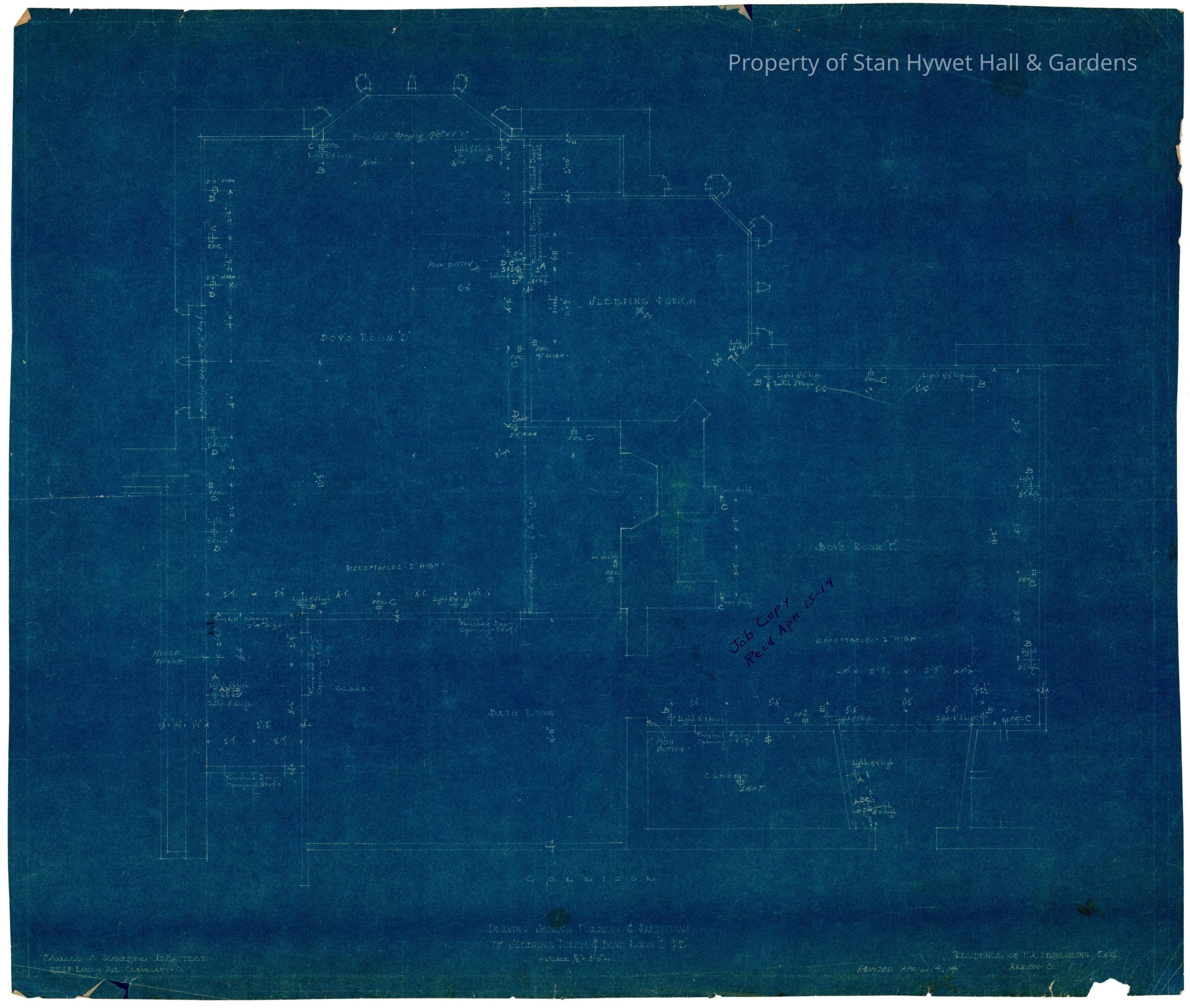 Historic blueprint: Plan for furring, partitions, and electrical of the Red Bedroom, Blue Bedroom, Boys' Bathroom, and Boys' Sleeping Porch at Stan Hywet Hall. Titled "Drawing Showing Furring & Partitions of Sleeping Porch & Boys Room 'D' & 'E'".