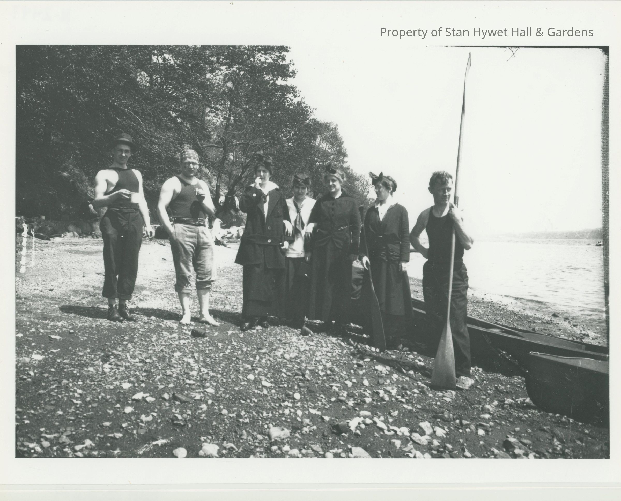 Black and white photograph of three men and four women standing next to two canoes on a rocky shore. Two men on left are wearing dark muscle shirts and have their pants rolled up. Four women stand on their left and all wear long dark skirts. with the lake in the background on right. Trees line the shore on the left.Photograph Details