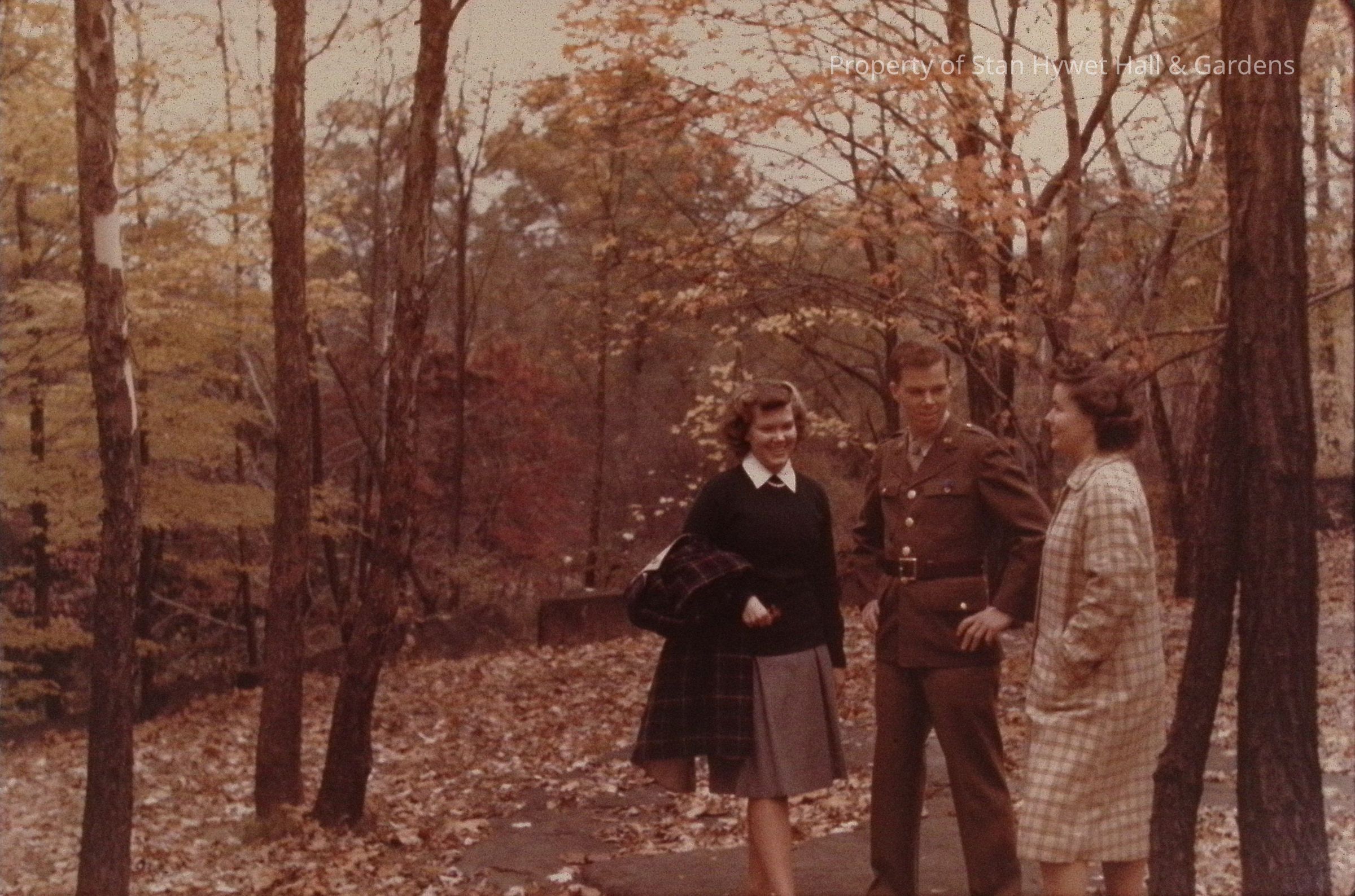 Color photograph. Julia Seiberling Shaw, Edward (Ned) Handy, and Nancy Jackson Seiberling standing on Pleasure Drive in fall. Leaves cover the ground while some are still on the trees. Julia is wearing gray skirt, blue sweater, white blouse and pearls and holding blue plaid coat over her arm. Edward with hands on hips in brown military uniform. Nancy, turned sideways, is wearing a beige and brown plaid coat. Group of three located at right side of image.Photograph Details