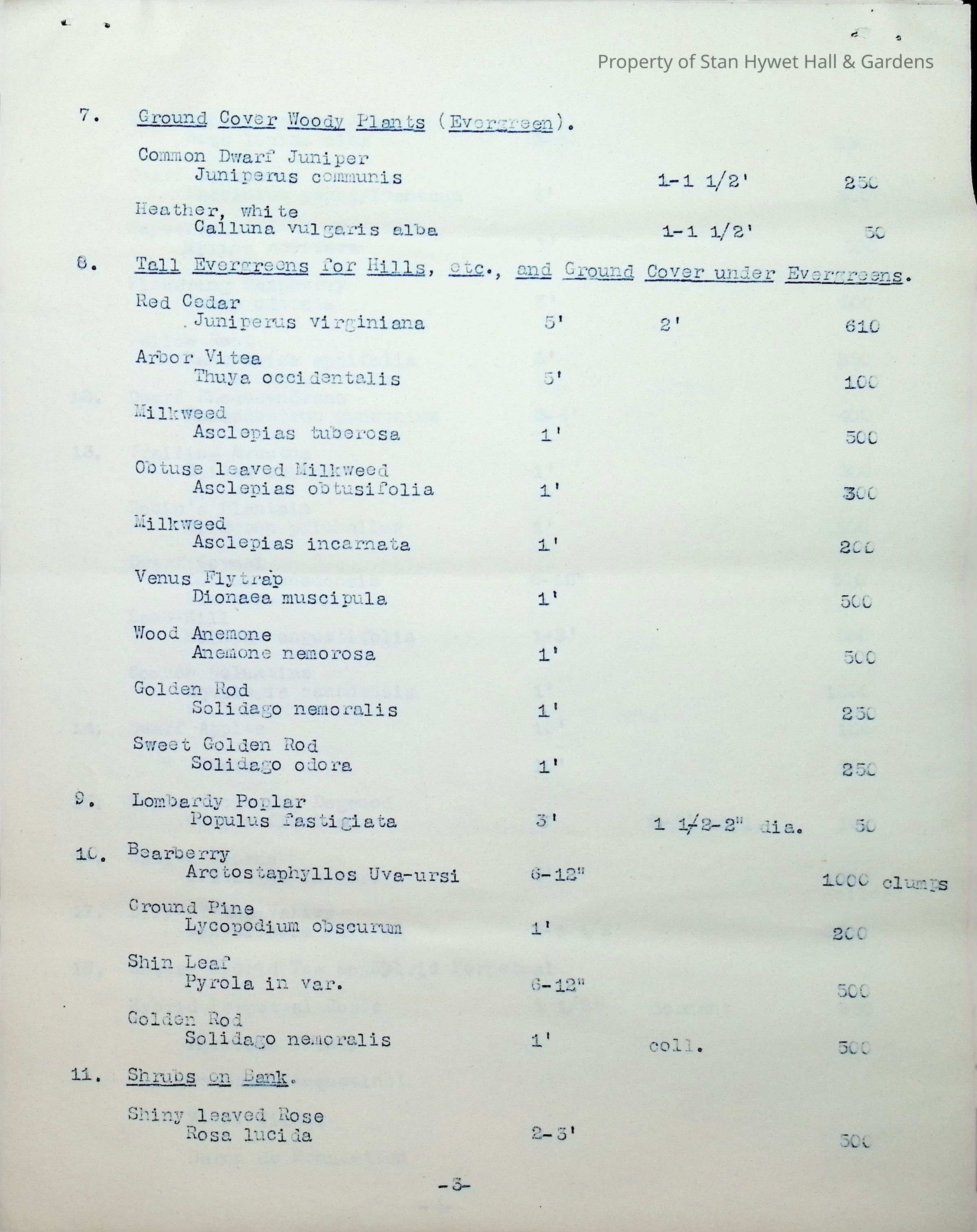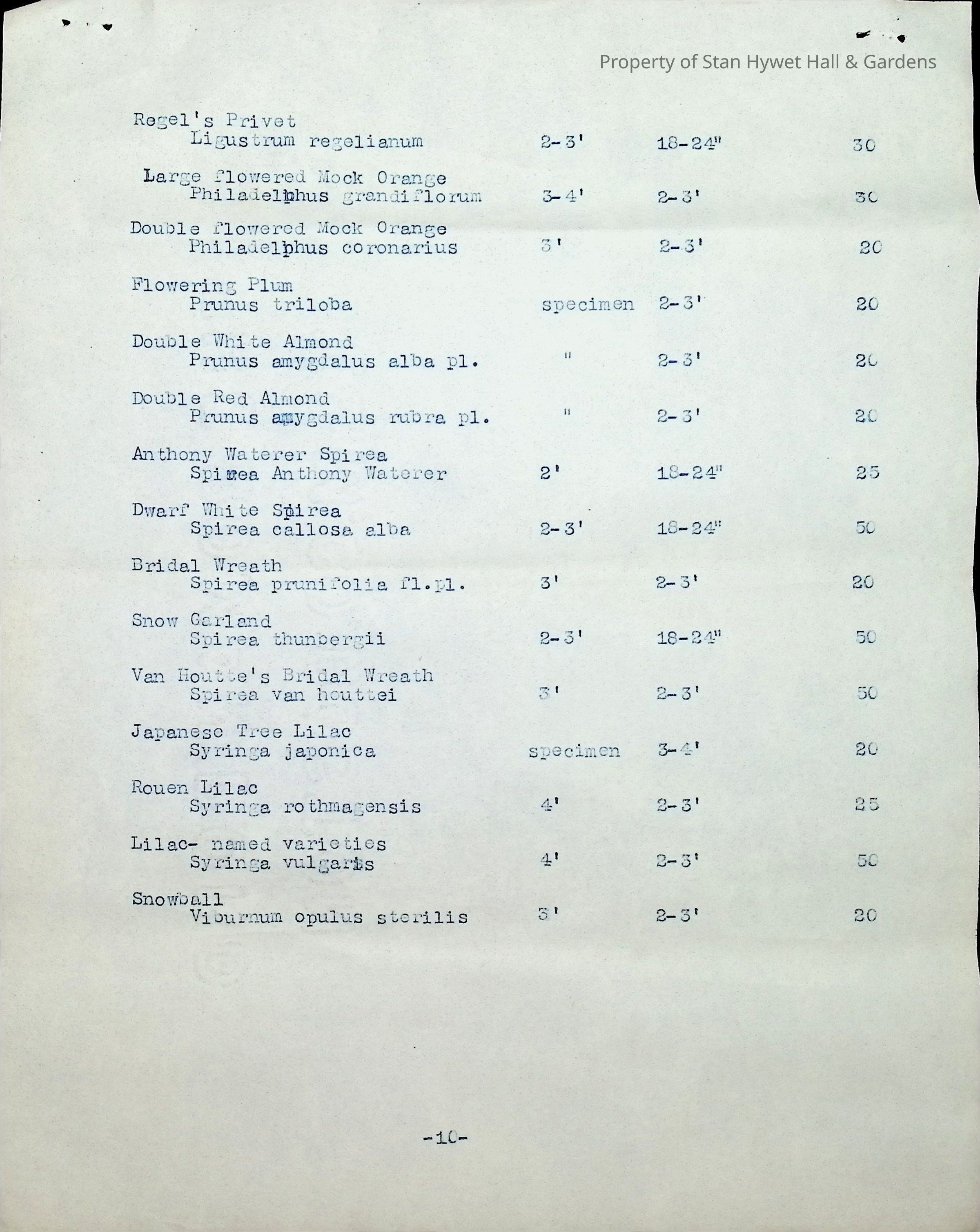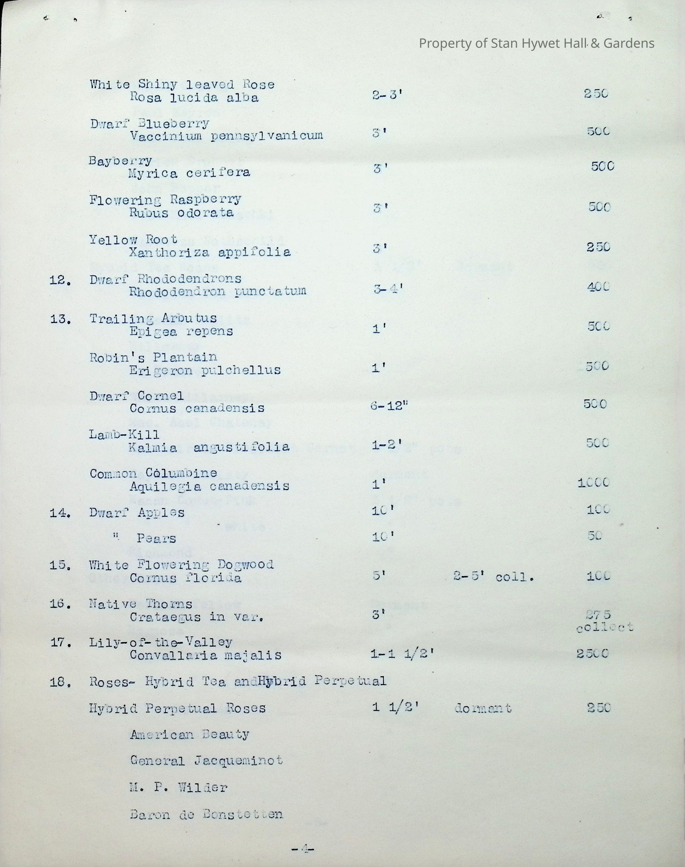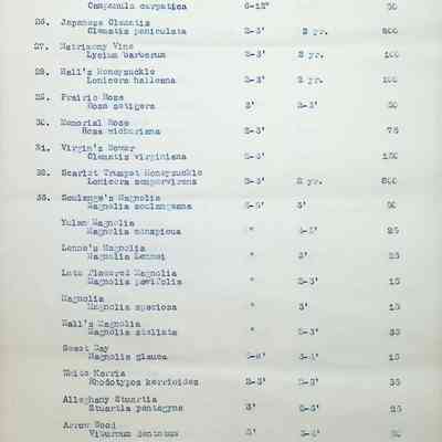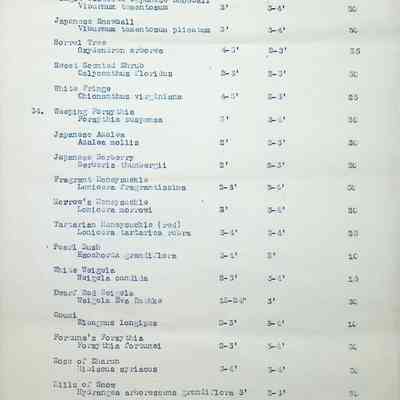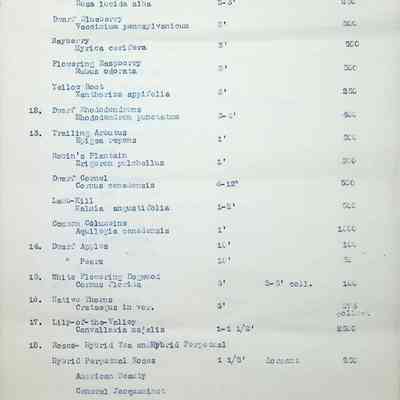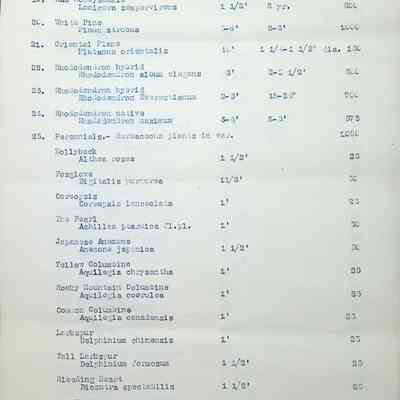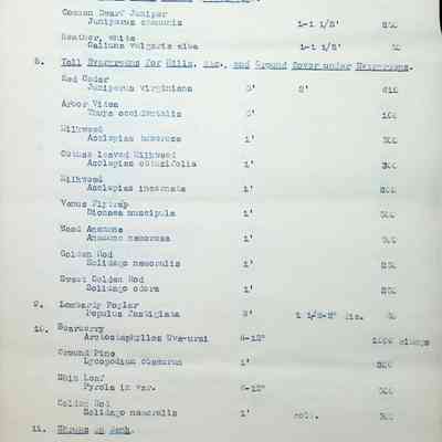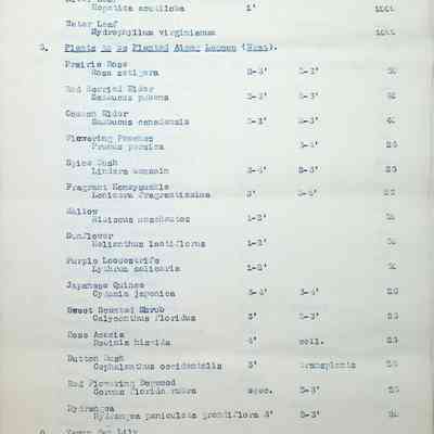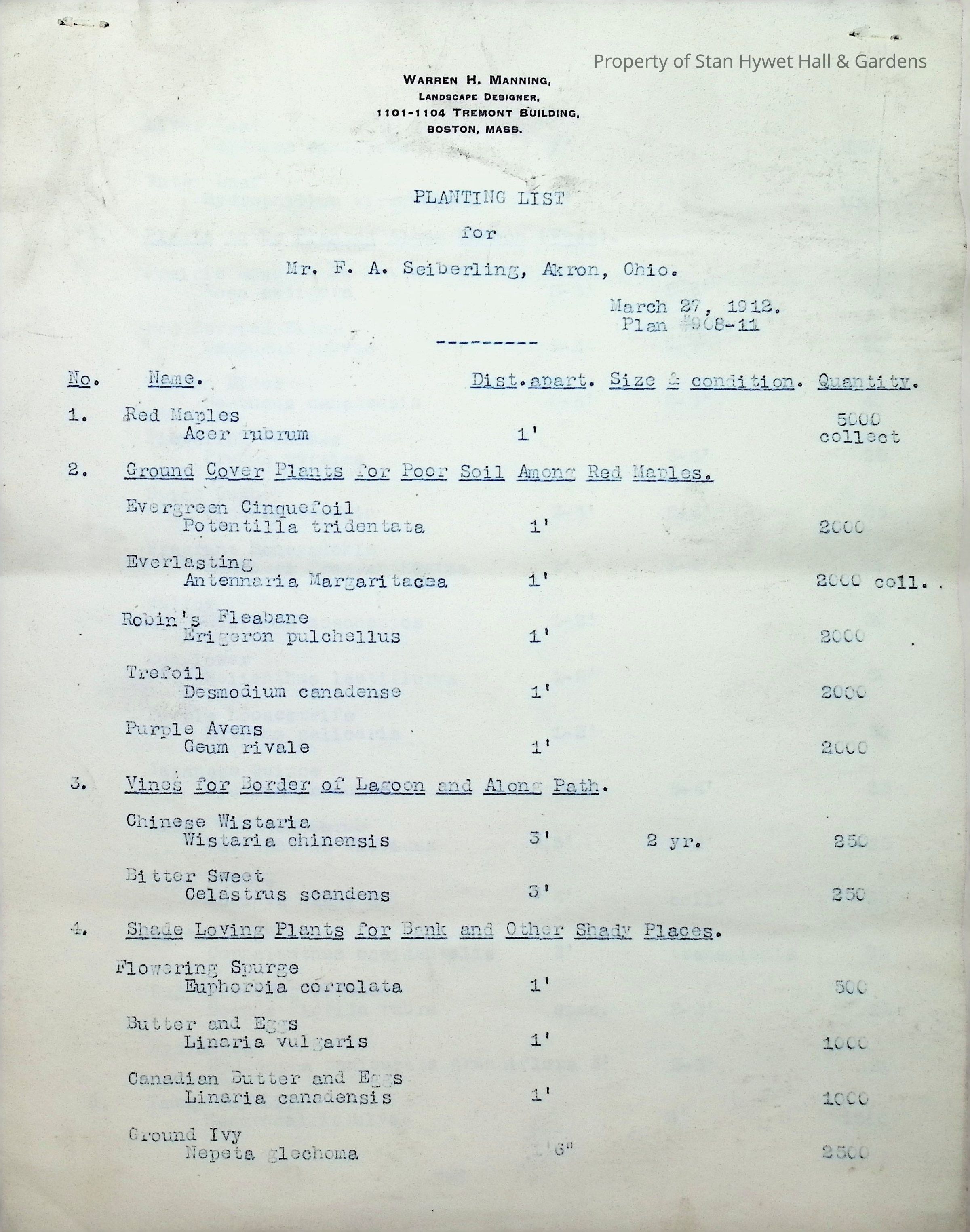Typewritten list on Warren H. Manning letterhead, written to Mr. Frank A. Seiberling, Akron, Ohio and dated March 27th, 1912, Plan #908-11. Detailed list of plantings for the entire property, including common & Latin plant names, planting distance apart, size & condition, and quantity.Subject