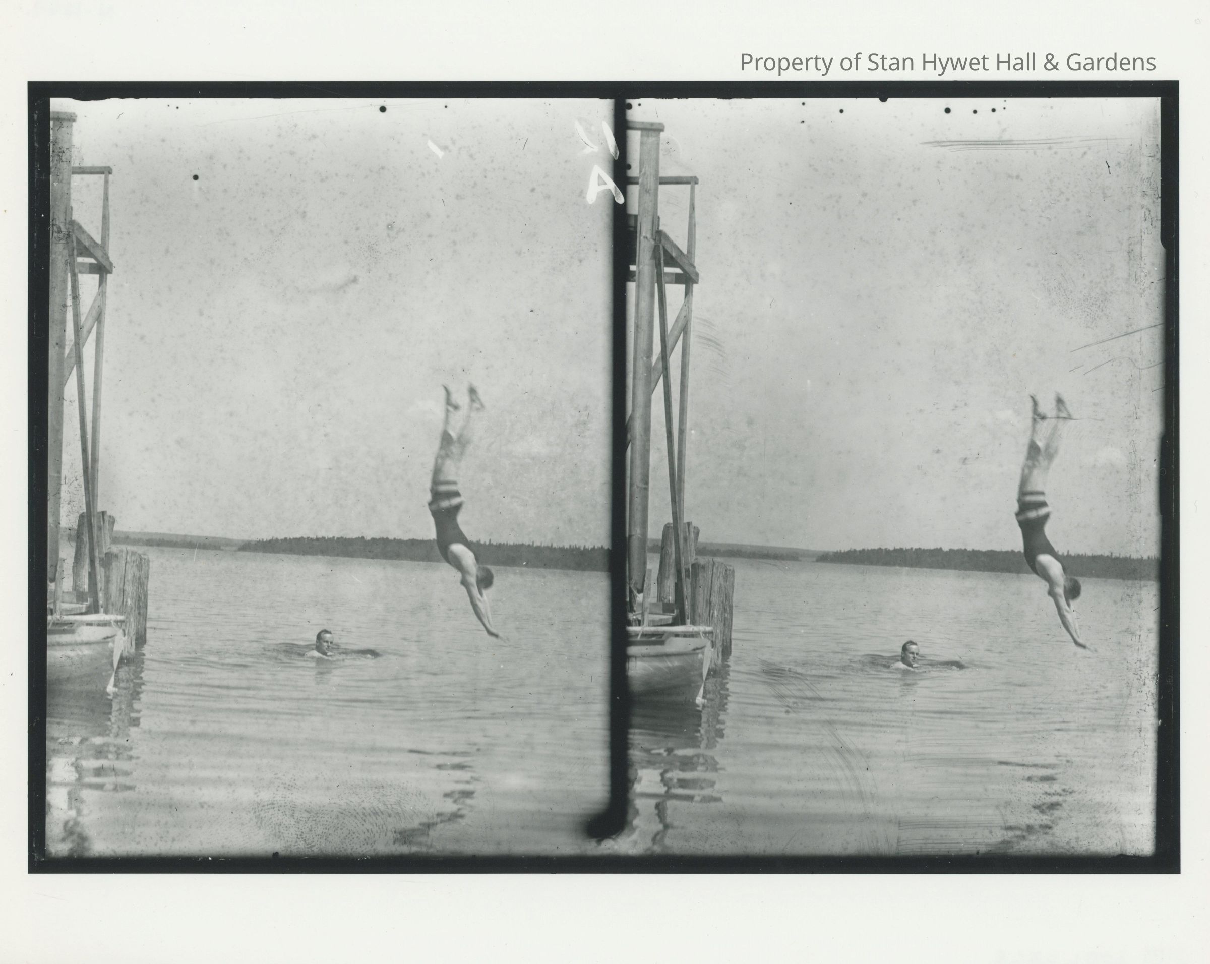 Stereograph image of an unidentified young male wearing swimsuit in mid-air dive about to enter the water as an unidentified young male in water watches. Diving platform and portion of visible sailboat in left side of image. Diver positioned vertically in mid-air in right edge and wooded islands in far middle ground. Same two unidentified men in SHH 2001.235R and SHH 2001.238R; possibly in SHH 2001.237R. Series of Cedar Lodge divers.Photograph Details