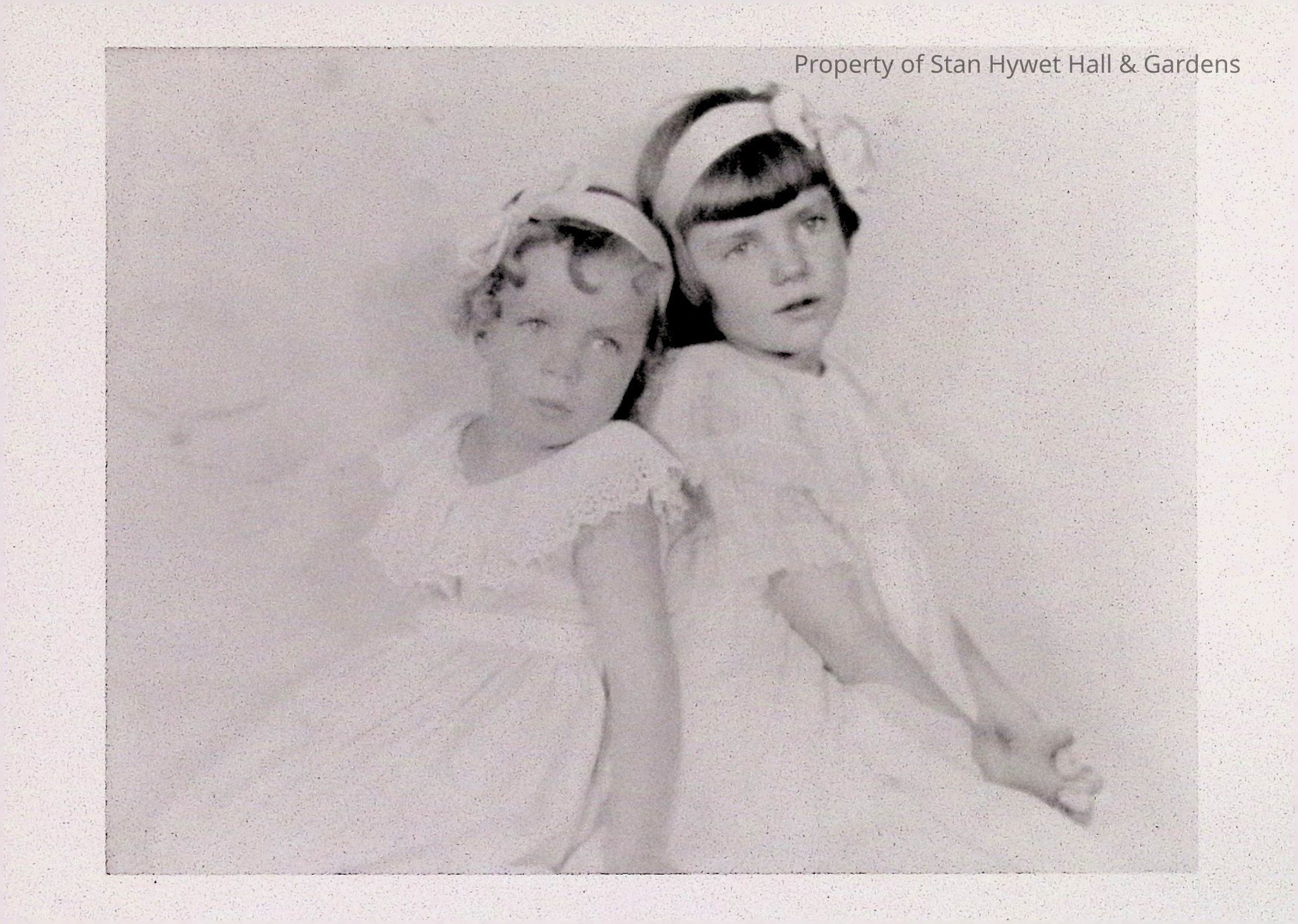 Black and white photographic print of Dorothy Buckler and Mary Gertrude Seiberling. Posed studio photo of seated subjects. Dorothy is seated on left of image facing camera with body turned slightly to proper right. Mary seated on right with back and shoulder next to Dorothy's. Both girls dressed in light-colored dresses and light-colored ribbons tied about their heads, with the bows at the sides. Mary posed with hands together on her lap. Dorothy's dress is sleeveless with a large white eyelet collar. Light-colored background.Photograph Details