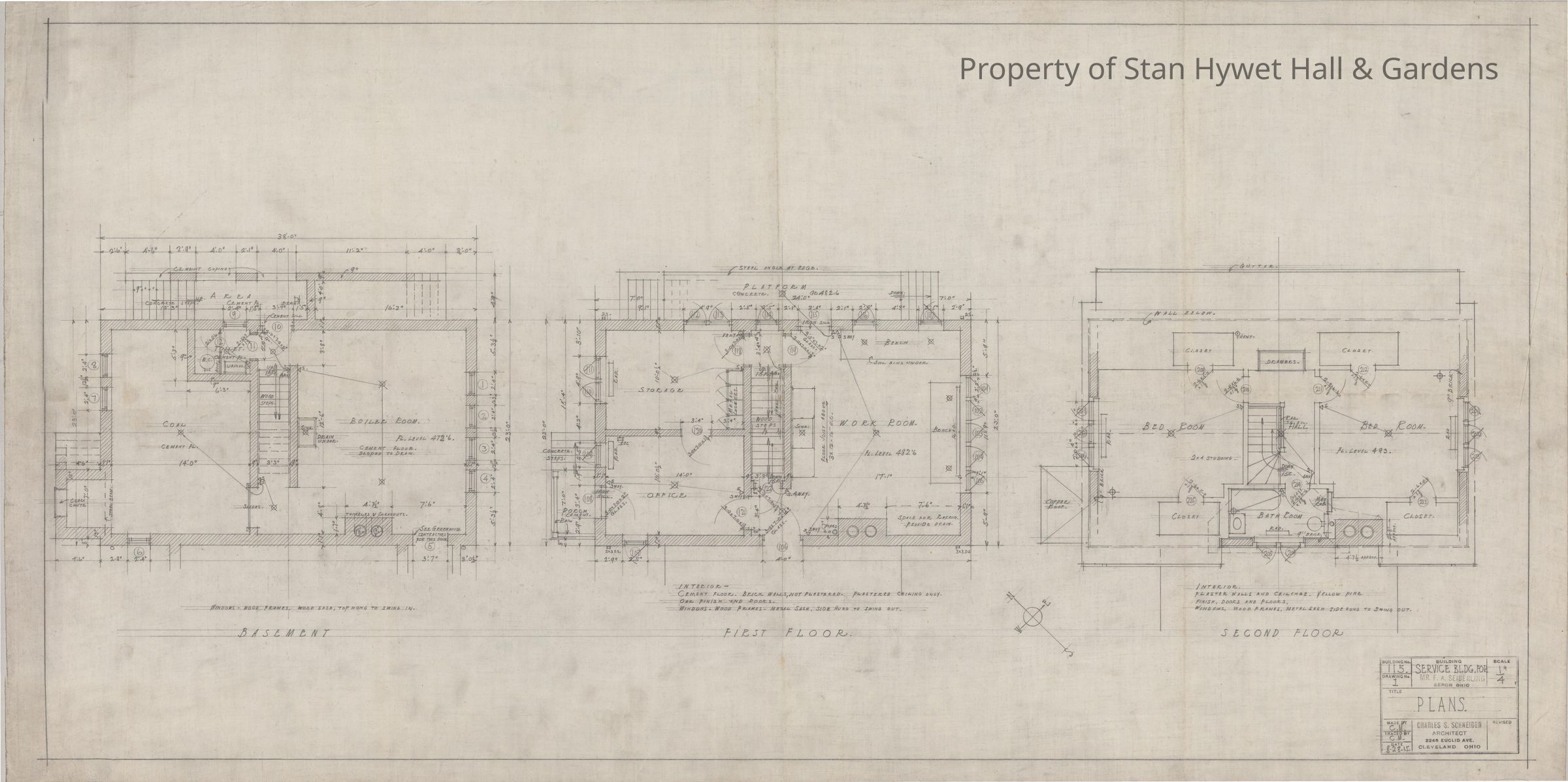 Historic Drawing: Basement, first, and second floor of Gardeners Cottage. Titled "Plans".