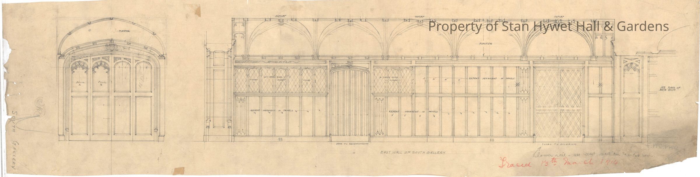 Historic drawing: Detailed drawing of the Linenfold Hallway's east wall, including the doors leading to the Reception Room and the Solarium. On the left side of the drawing there is a detailed depiction of a door, potentially a concept for the folding doors to the Round Room. Titled "East Side of South Gallery".Collection