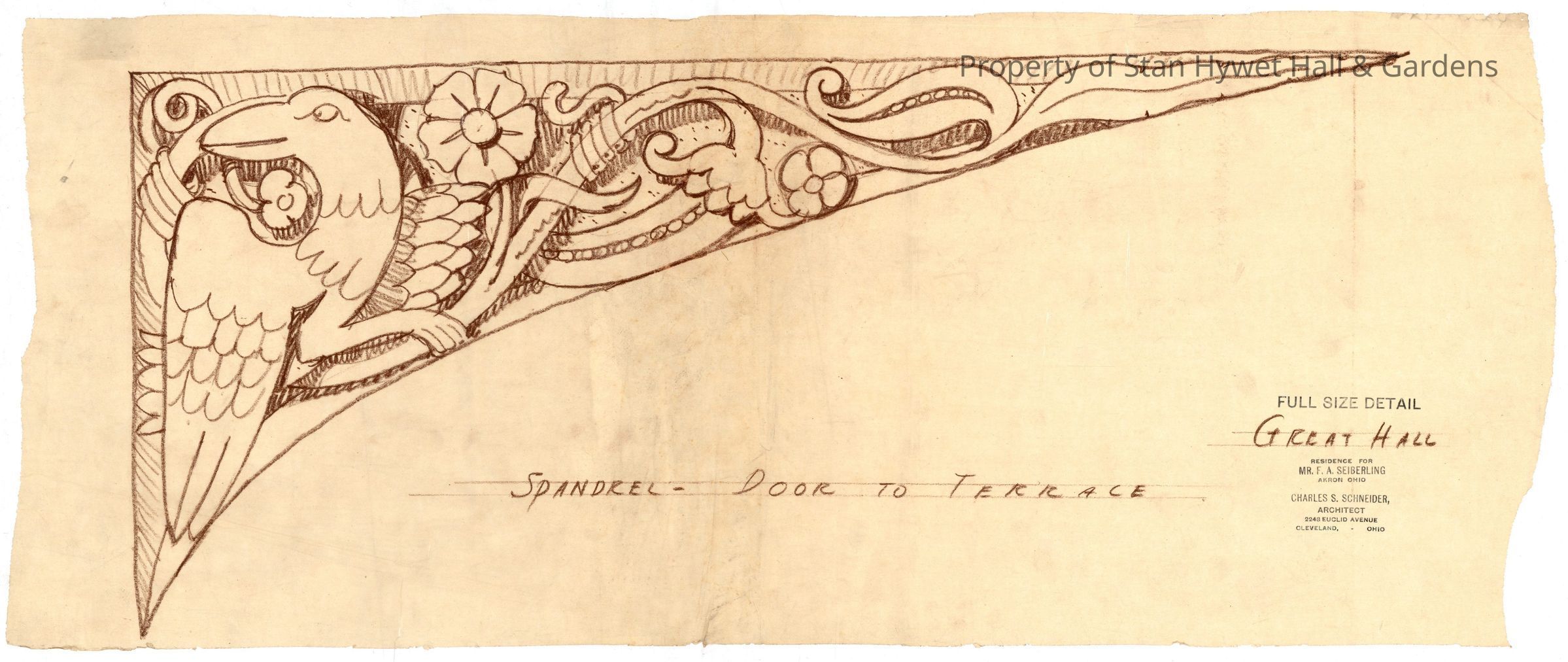 Historic Drawing: Full sized detail of the spandrel over the back doorway in the Great Hall out onto the West Terrace. Titled "Spandrel-Door to Terrace".