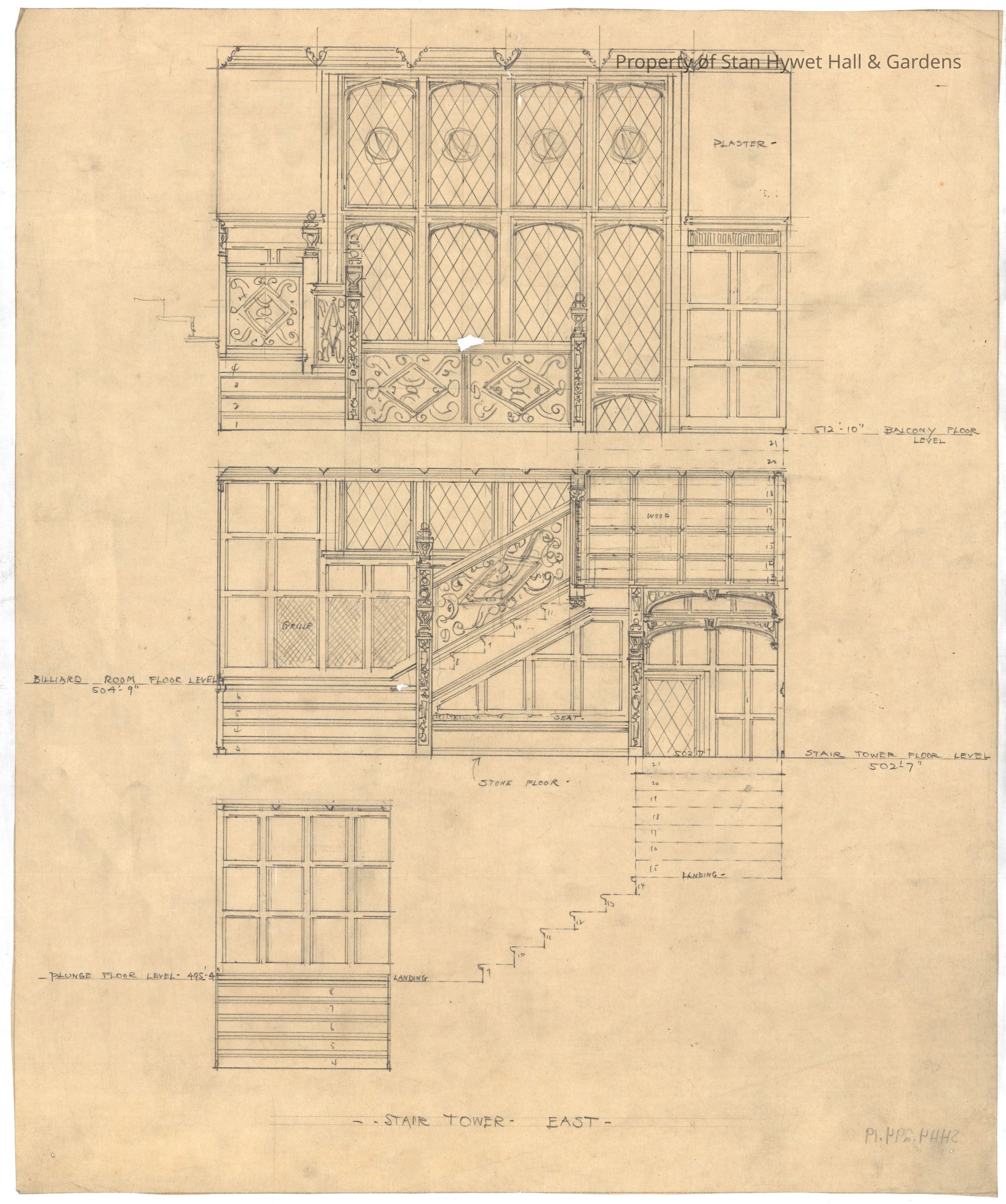Historic drawing: Detailed drawing of all three floors (Lower Level to 2nd floor) of the Stair Tower's east wall, including the banisters and windows. Titled "Stair Tower East".Collection