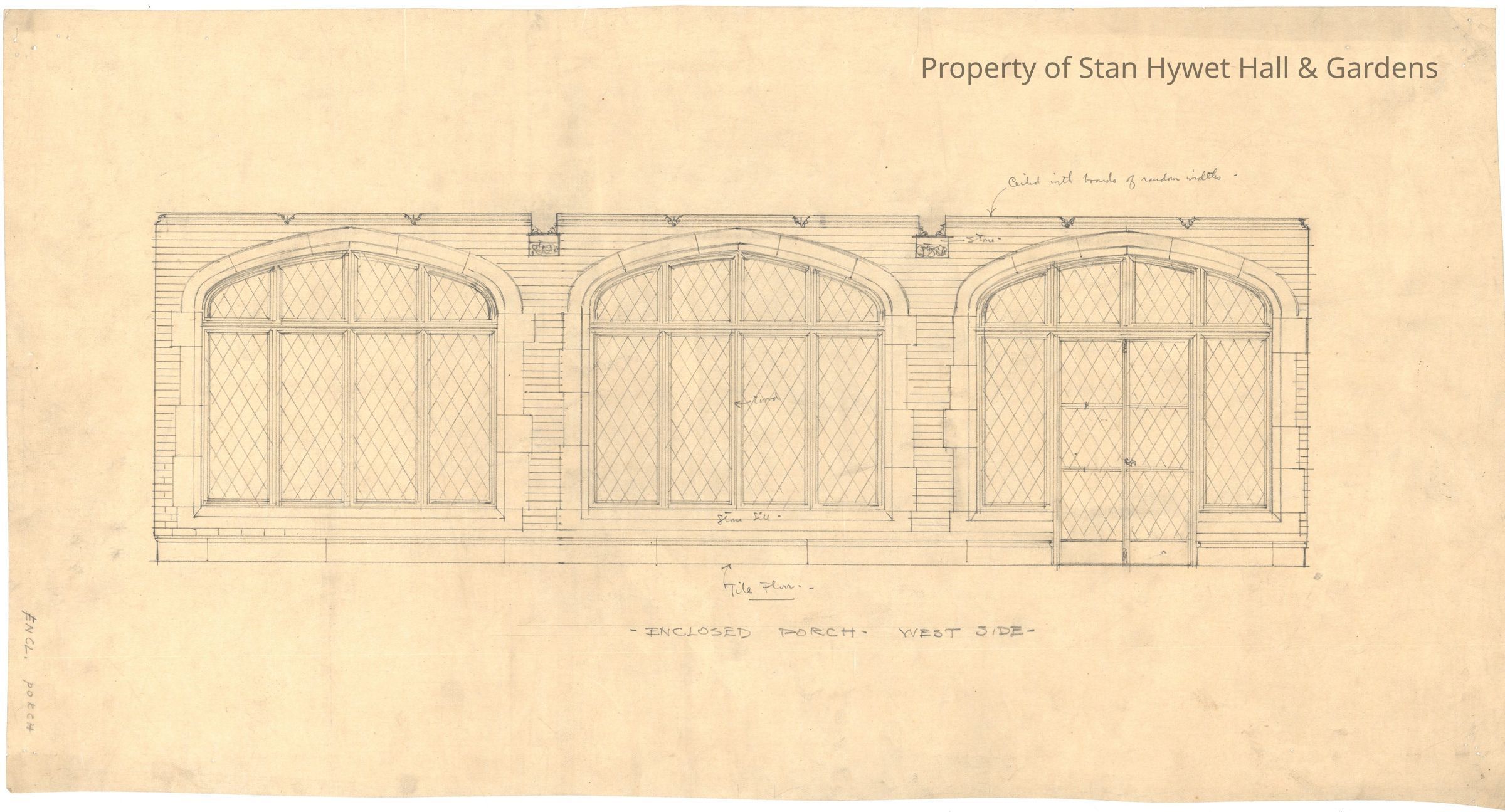 Historic drawing: Detailed drawing of the West Porch's west wall. Titled "Enclosed Porch West Side".Collection