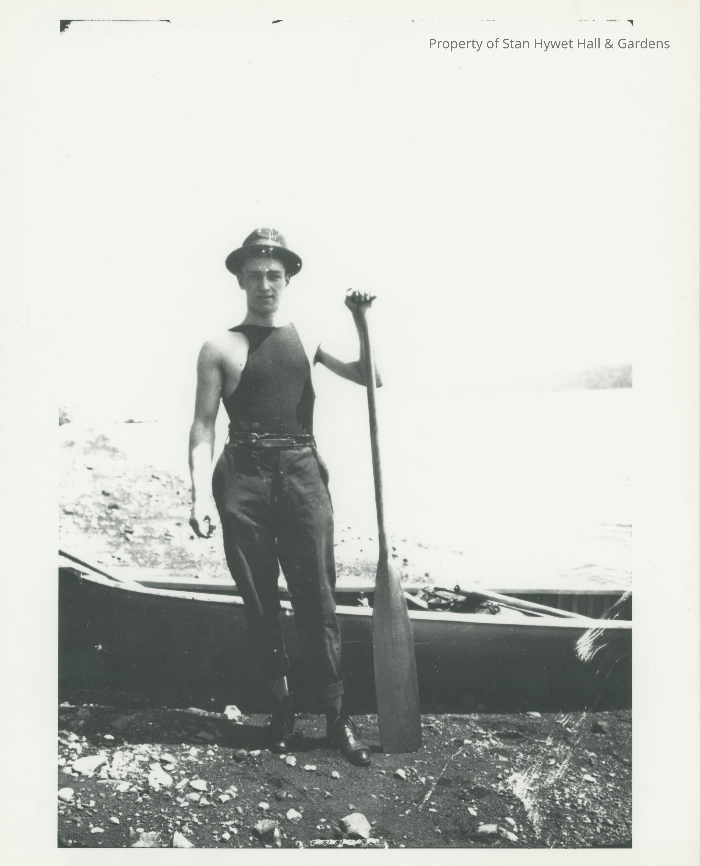 Black and white photograph of a young man with an oar standing next to a canoe on the lakeshore. He is wearing black slacks, a black muscle shirt and a dark hat with a lighter band.Photograph Details