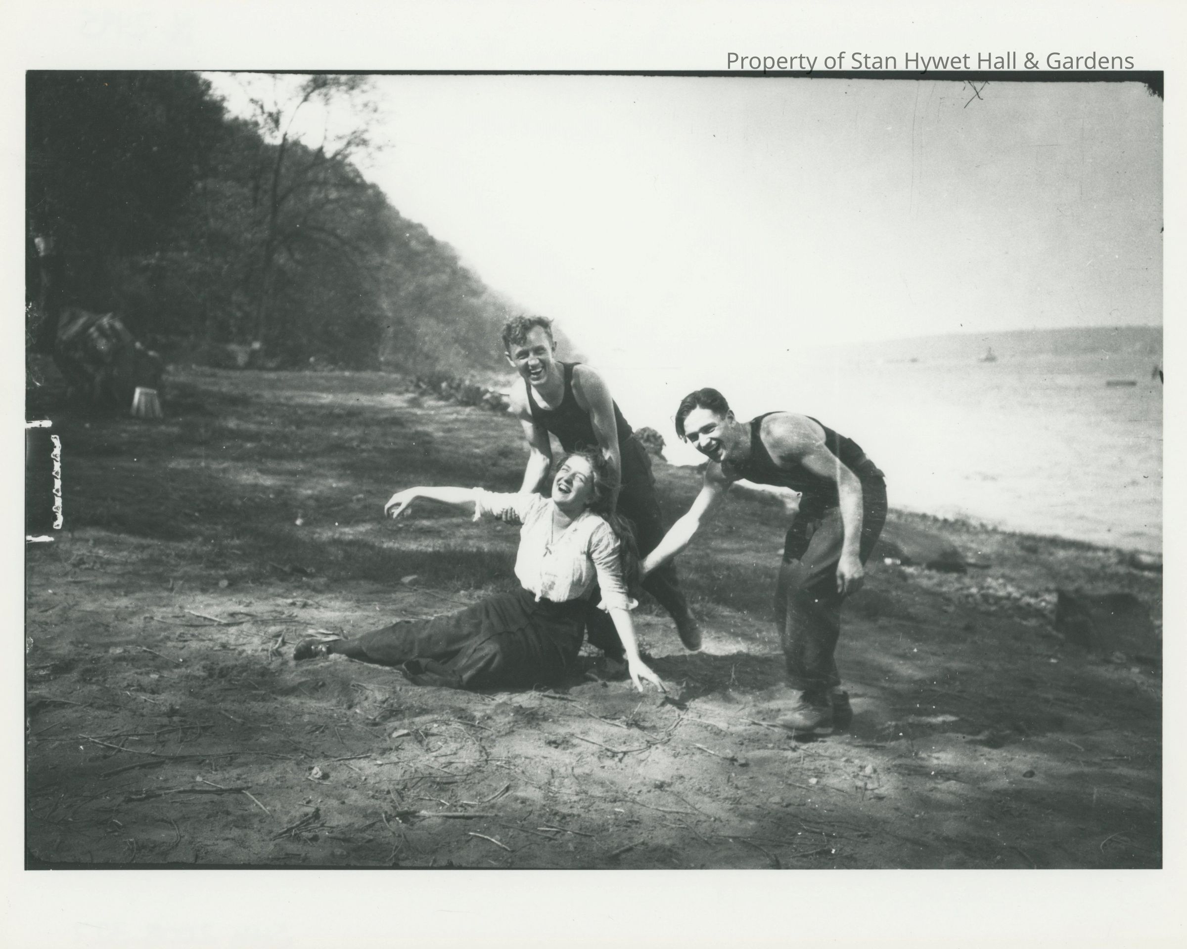 Black and white reproduction photo of a two young men and a young lady playing around on shore of Lake Huron. Both men are wearing dark pants and black muscle shirts. The young lady is sitting on the ground with her legs bent to one side and her arms outstretched. She is wearing a dark skirt and white blouse. They are all laughing.Photograph Details