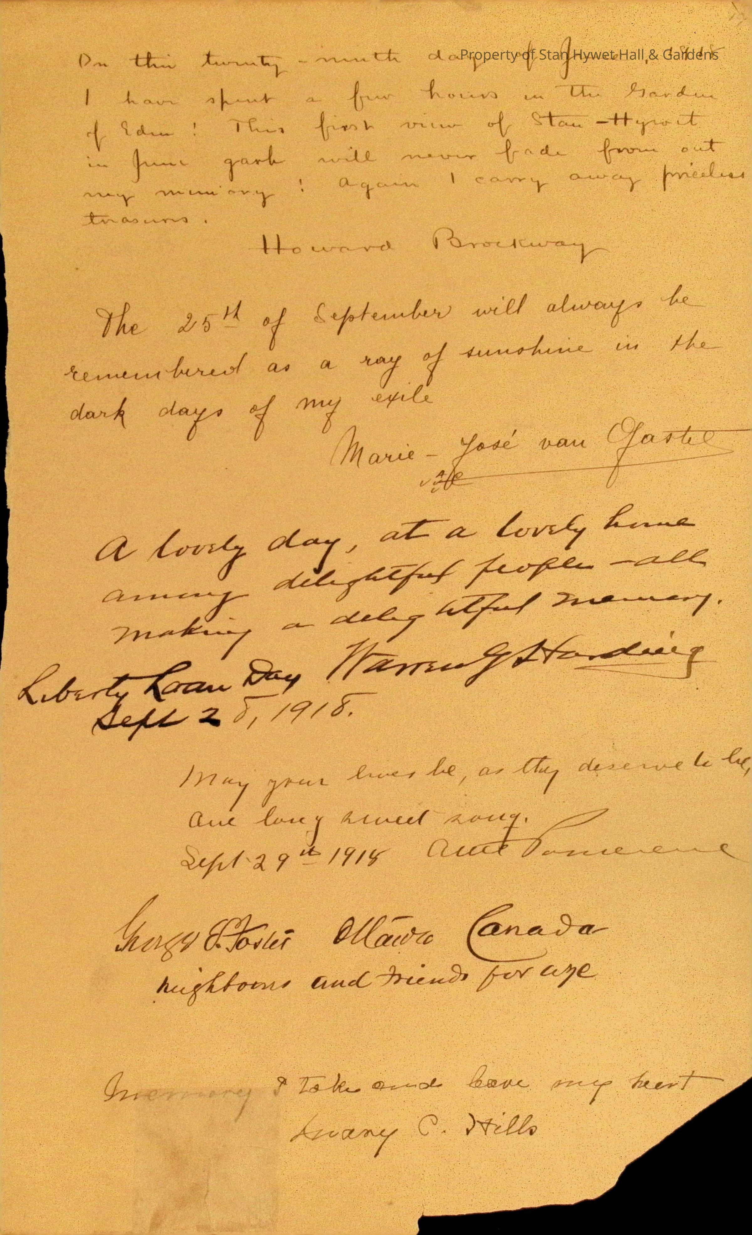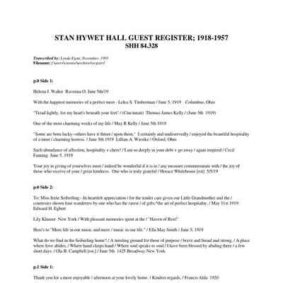 Embossed leather covered guest book donated to Stan Hywet Hall in 1984 by Mary Seiberling Chapman. Originally belonged to the Seiberling’s and Stan Hywet Hall. Includes numerous famous signatures such as: Cecil Fanning [1919, 1928], James Melton [1928], Rosa Ponselle [1925], Francesco B. DeLeone [1925], William Taft [1919], Catherine Breshnovsky [1919], Warren G. Harding (1918). Guest book has been transcribed by Linda Egan in 1995