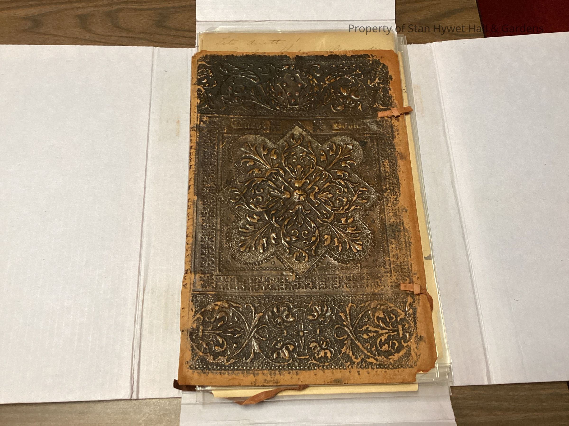 Leather covered guest ledger. Brown leather cover, back and spine with two leather straps/ties. Leather cover and back tooled with square floral border in center. Floral pattern within square floral border. Words "Guest Book" located along upper edge of square floral border. More elaborate floral patterns above and below center.Collection
