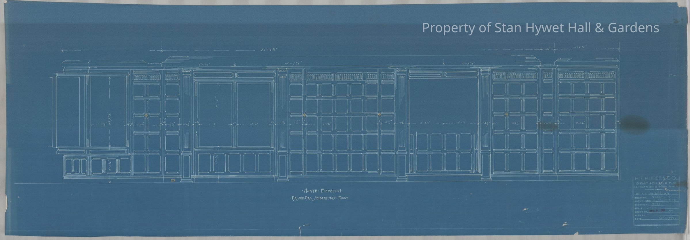 Historic blueprint: North elevation of Master Bedroom at Stan Hywet Hall. Titled "North Elevation of Mr. and Mrs. Seiberling's Room".
