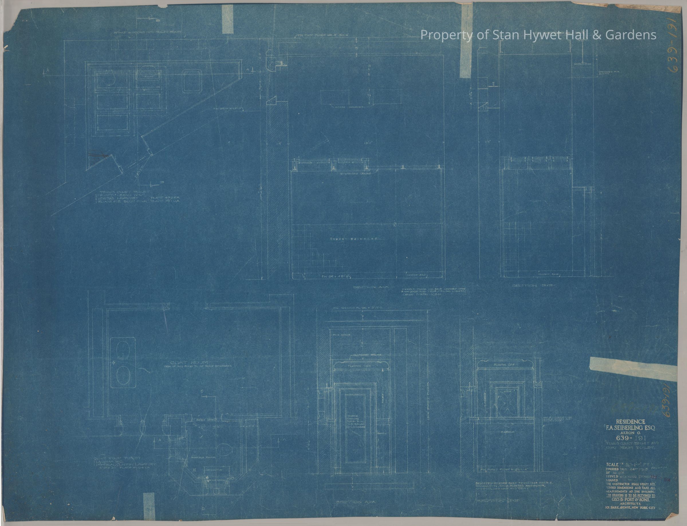 Historic blueprint: Detailed plans and elevations for the Auditorium Bathroom and the Powder Room. Titled "Tennis Court Toilet and Coat Room Toilet".