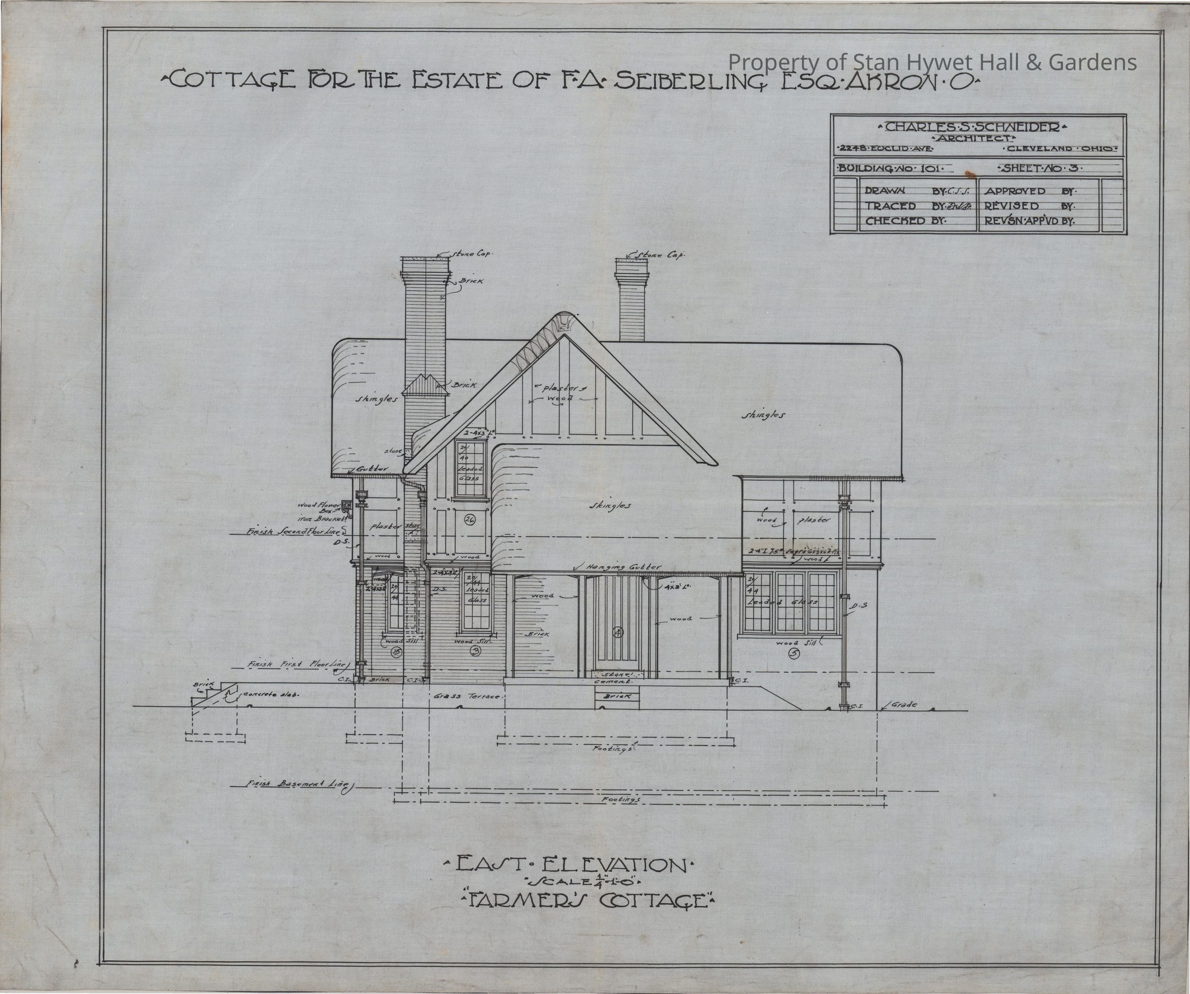 Historic architectural drawing: East elevation of the Farmer's Cottage. Titled "Cottage for the Estate of F.A. Seiberling, ESQ, Akron O".