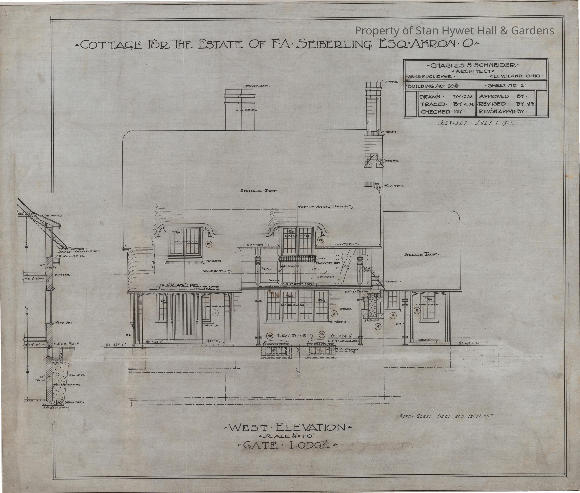 Historic Drawing: West elevation of Gate Lodge. Titled "Cottage for the estate of F.A. Seiberling, ESQ, Akron O".
