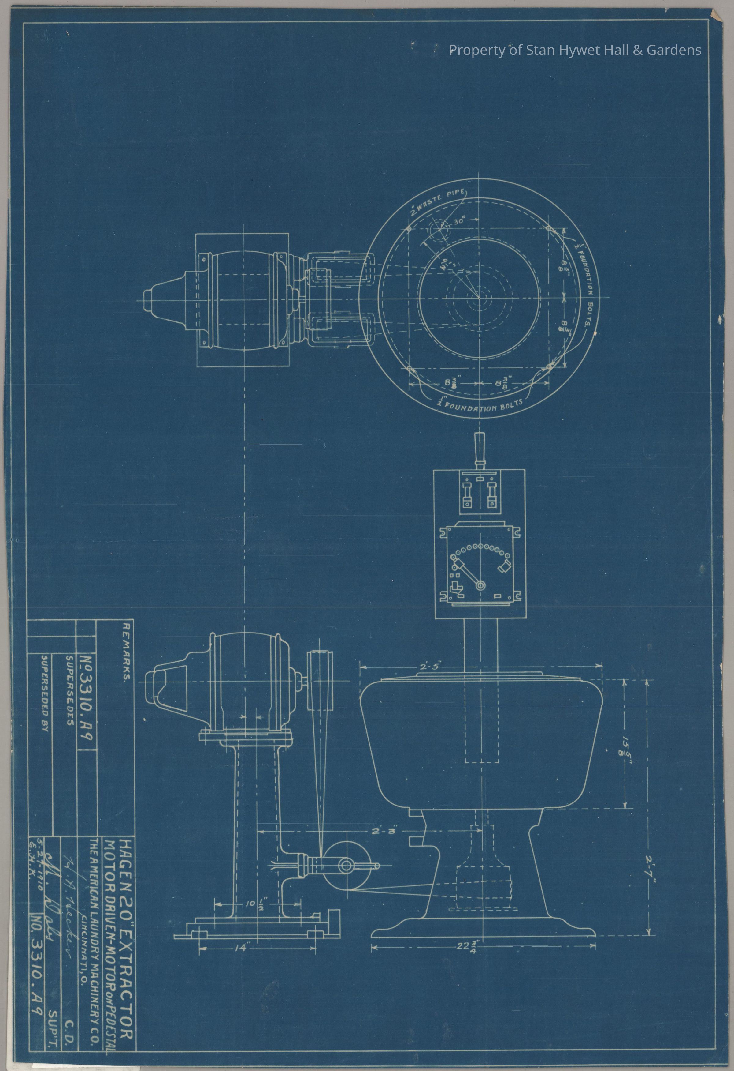 Historic Blueprint: Hagen 20" Extractor motor driven-motor on pedestal laundry machine in the Laundry Room