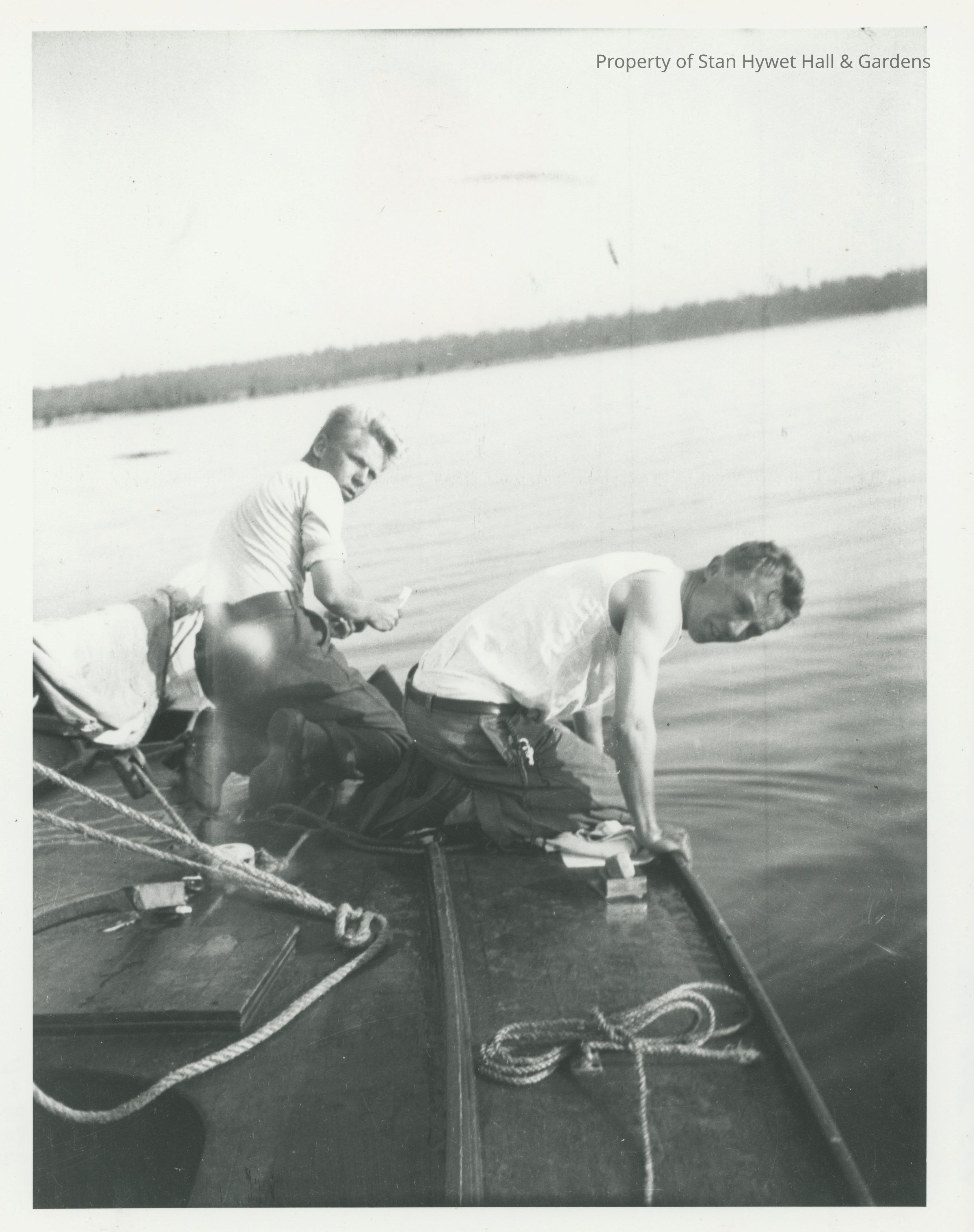 Black and white photograph of Willard Seiberling (left) and Fred Seiberling on the edge of a sailboat leaning into the water.Photograph Details