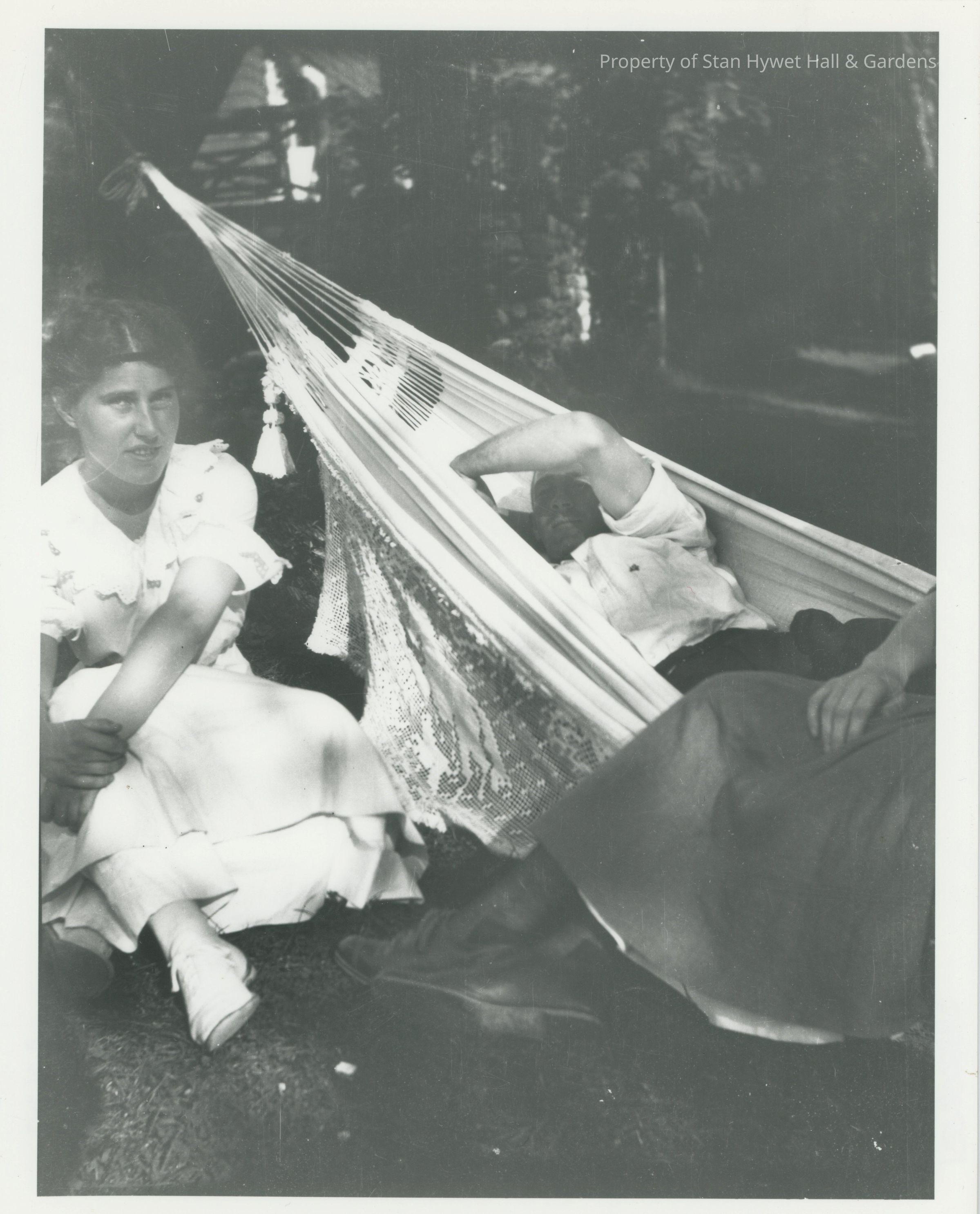 Black and white reproduction photograph. A man is lying in a hammock with his left arm shadowing his face. A woman is seated on the hammock facing toward him, only visible from the top of the legs down, covered in dark skirts, with her right hand on her leg. A woman is seated on ground next to the hammock leaning toward it. A cottage or house is visible in background.Photograph Details