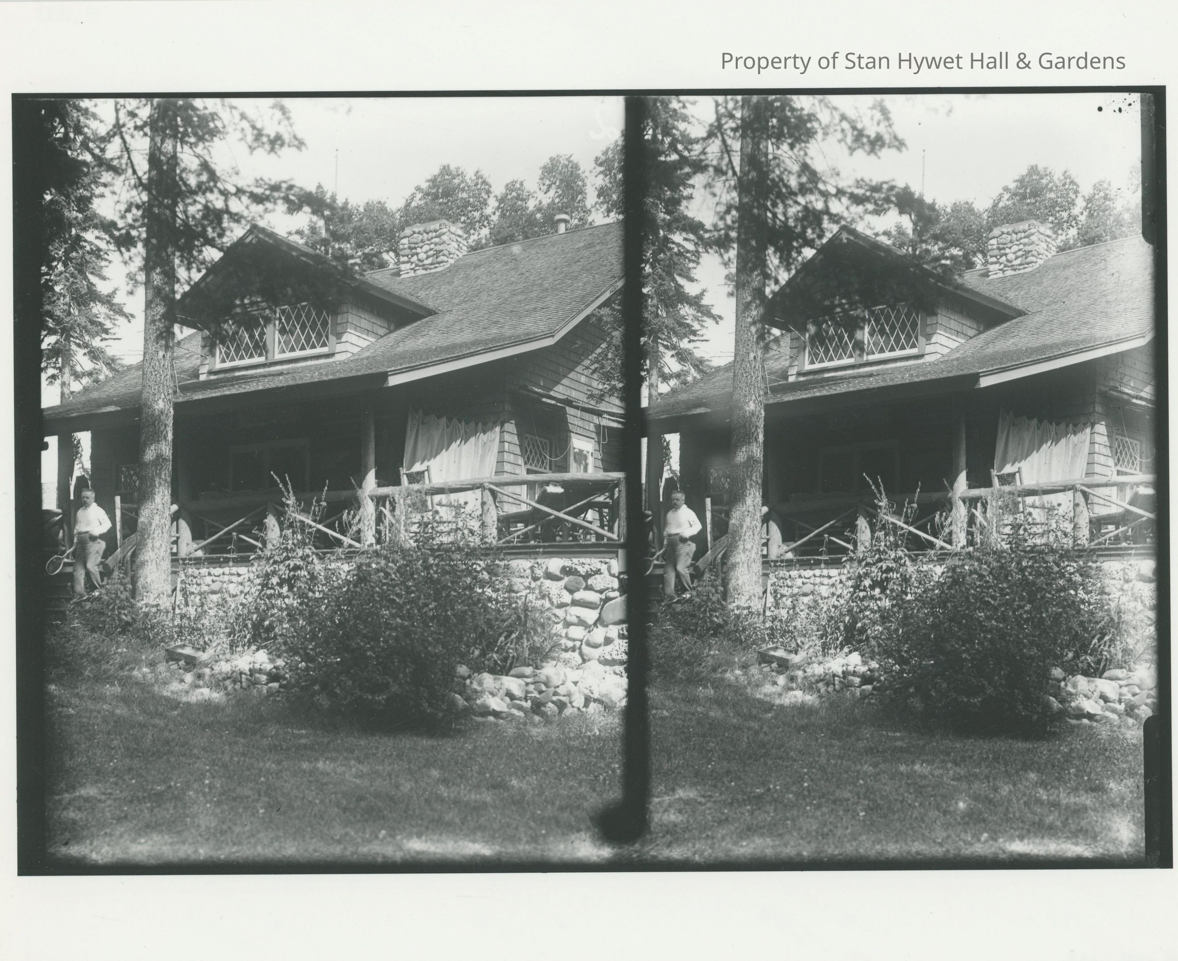 Black and white stereograph of F.A. Seiberling holding a tennis racket, coming down the steps of the Main Cabin at Cedar Lodge. In front of the porch is a small stone wall with plants beside it. The lower portion of the porch is a rock wall. The porch railing is rustic logs. Wooden furniture is on the porch. Trees are in the left of the image and behind the house in the background. Series of Main Cottage prints.Photograph Details