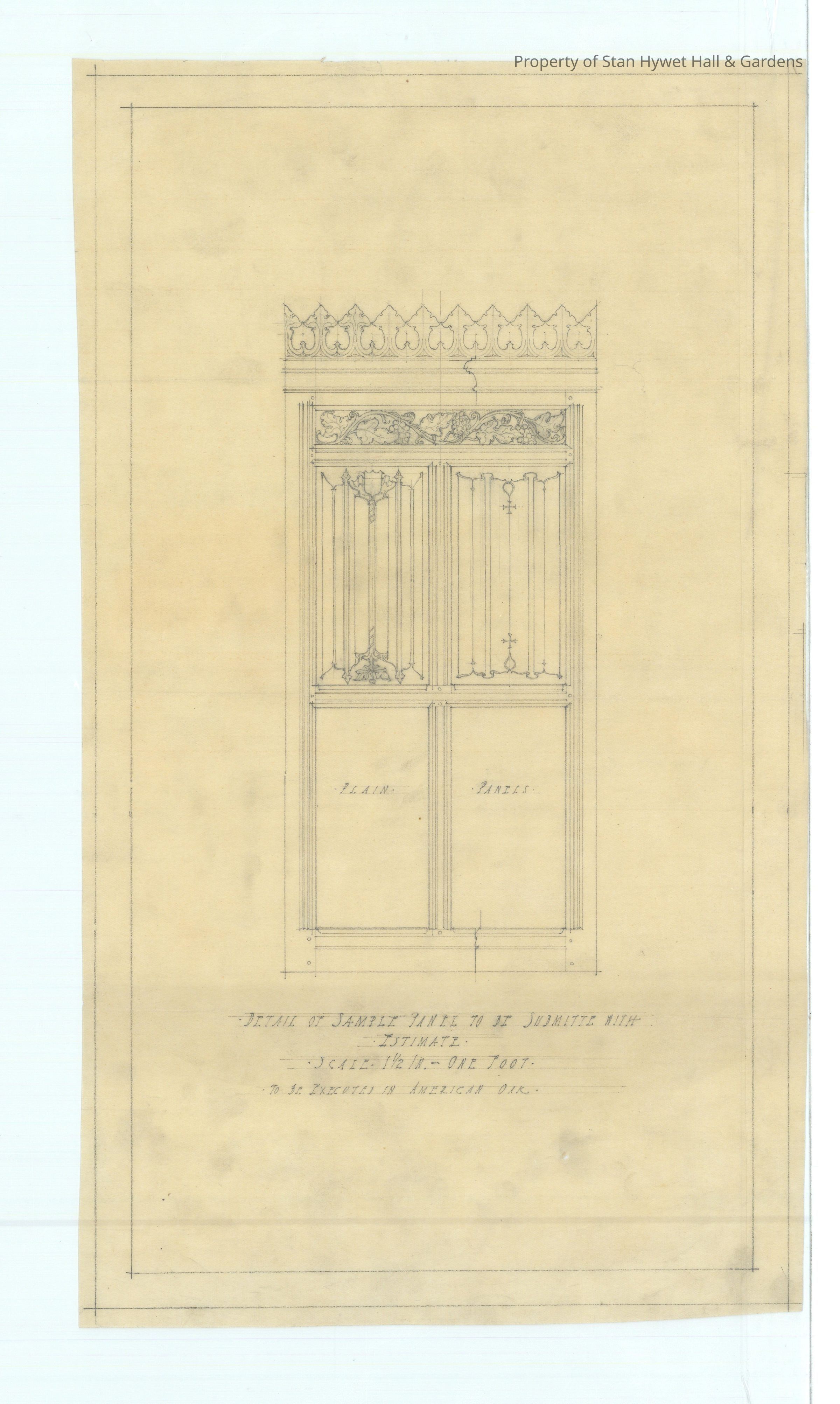 Historic drawing: Detailed drawing of sample panel for Linenfold Hallway. Titled "Detail of Sample Panel to be Submitte[d] with Estimate".