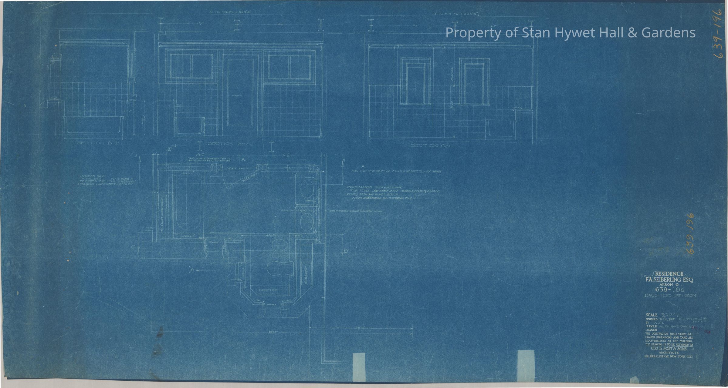 Historic Blueprint: Plan and elevations of Girls' Bathroom in Stan Hywet Hall. Titled "Daughters Bathroom".