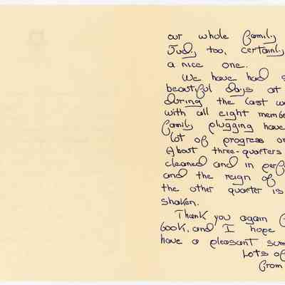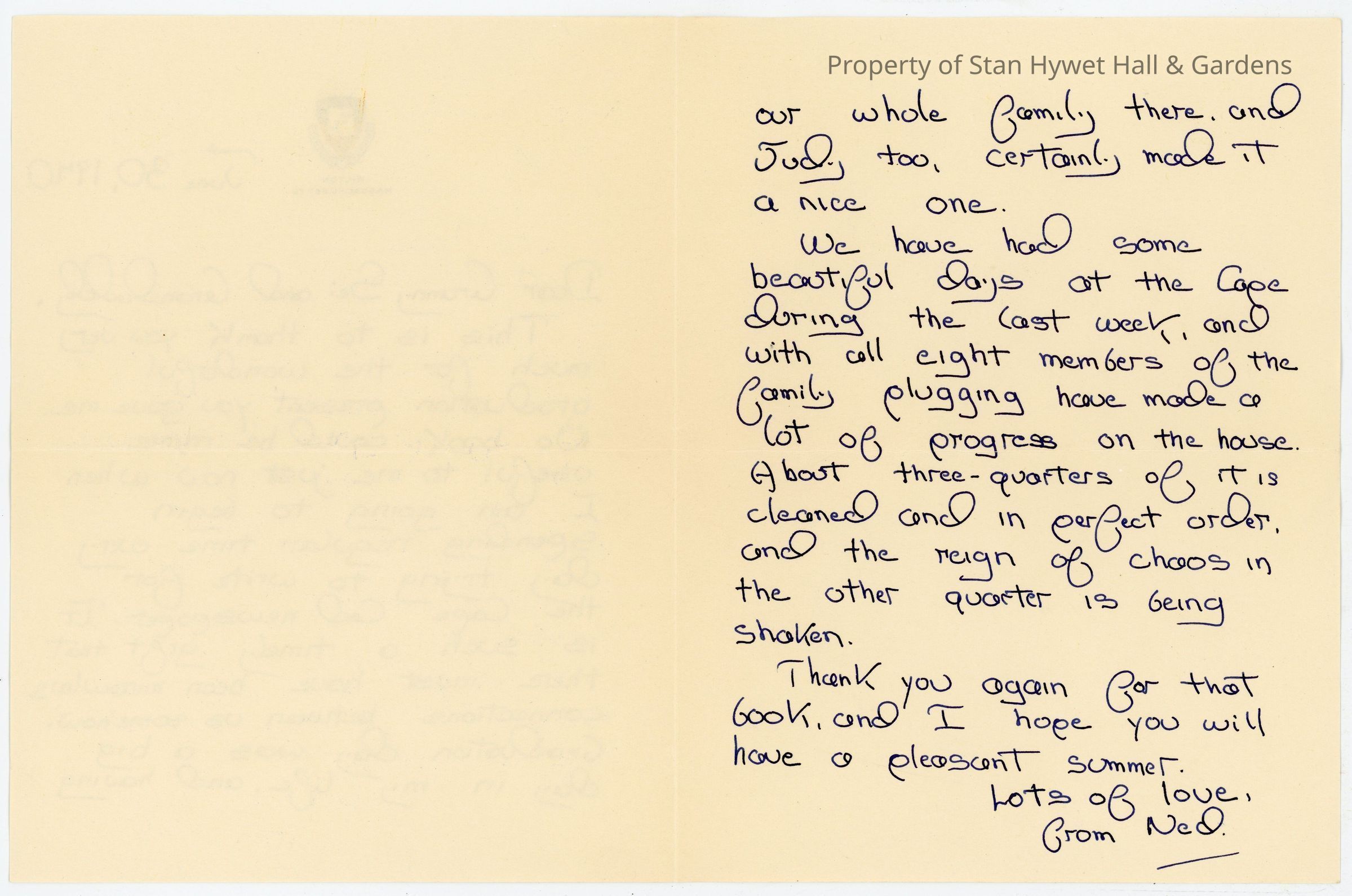 Dear Granny Sei and Grandaddy, / This is to thank you very much for the wonderful graduation present you gave me. No book could be more useful to me just now when I am going to begin spending regular time every day trying to write for the Cape Code newspaper. It is such a timely gift that there must have been miraculous connections between us somehow. Graduation day was a big day in my life, and having our whole family there, and Judy too, certainly made it a nice one. / We have had some beautiful days at the Cape during the last week and with all eight members of the family plugging have made a lot of progress on the house. About three-quarters of it is cleaned and in perfect order, and the reign of chaos in the other quarter is being shaken. / thank you again for that book and I hope you will have a pleasant summer. / Lots of love, / from NedTranscriber