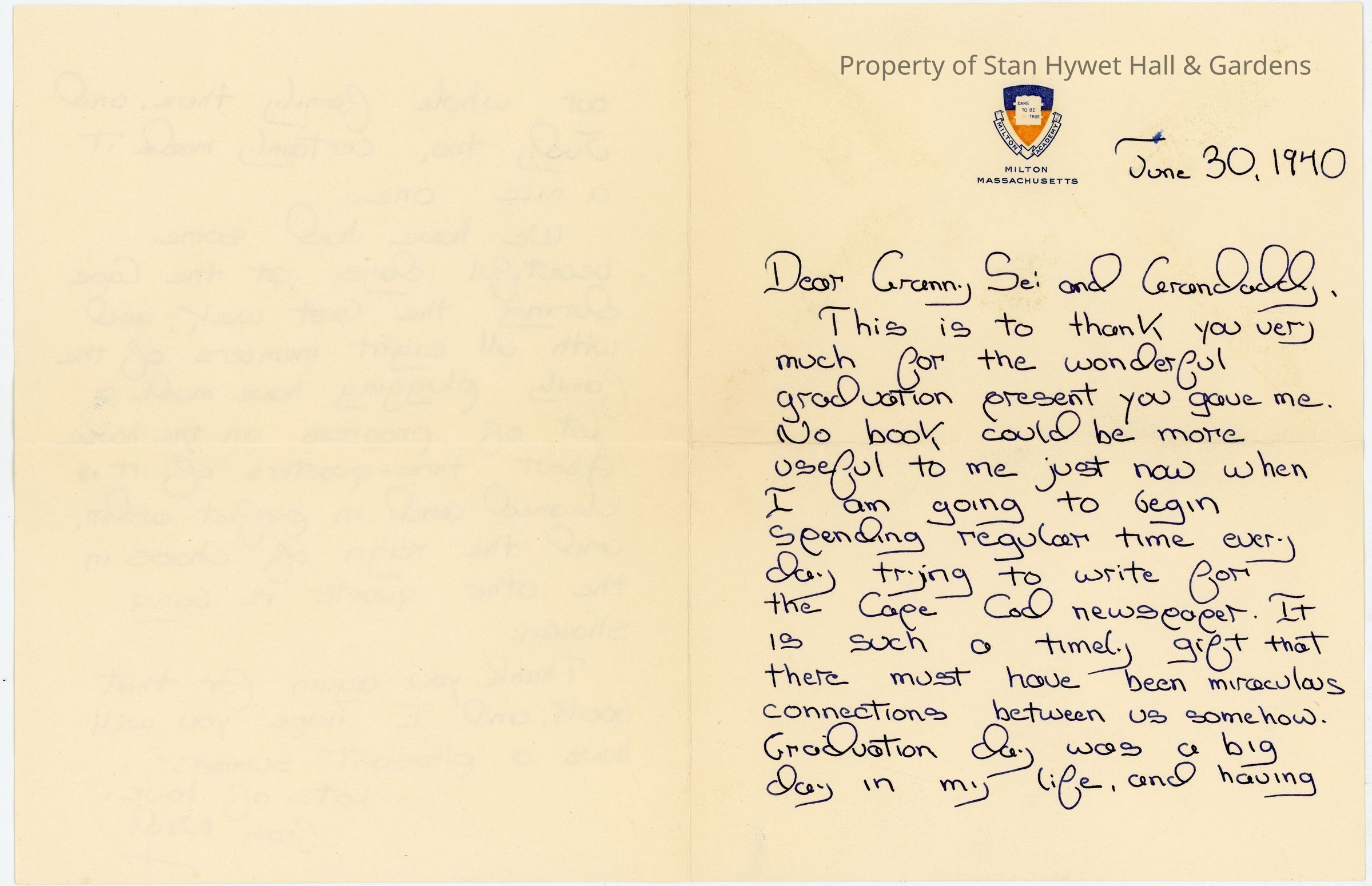 Handwritten letter from Ned Handy to F.A. and Gertrude Seiberling, addressed to Granny Sei and Grandaddy, thanking them for a graduation gift of a book. Ned mentions how it will be useful as he will be writing for the Cape Cod newspaper which implies it was a notebook or journal.Collection