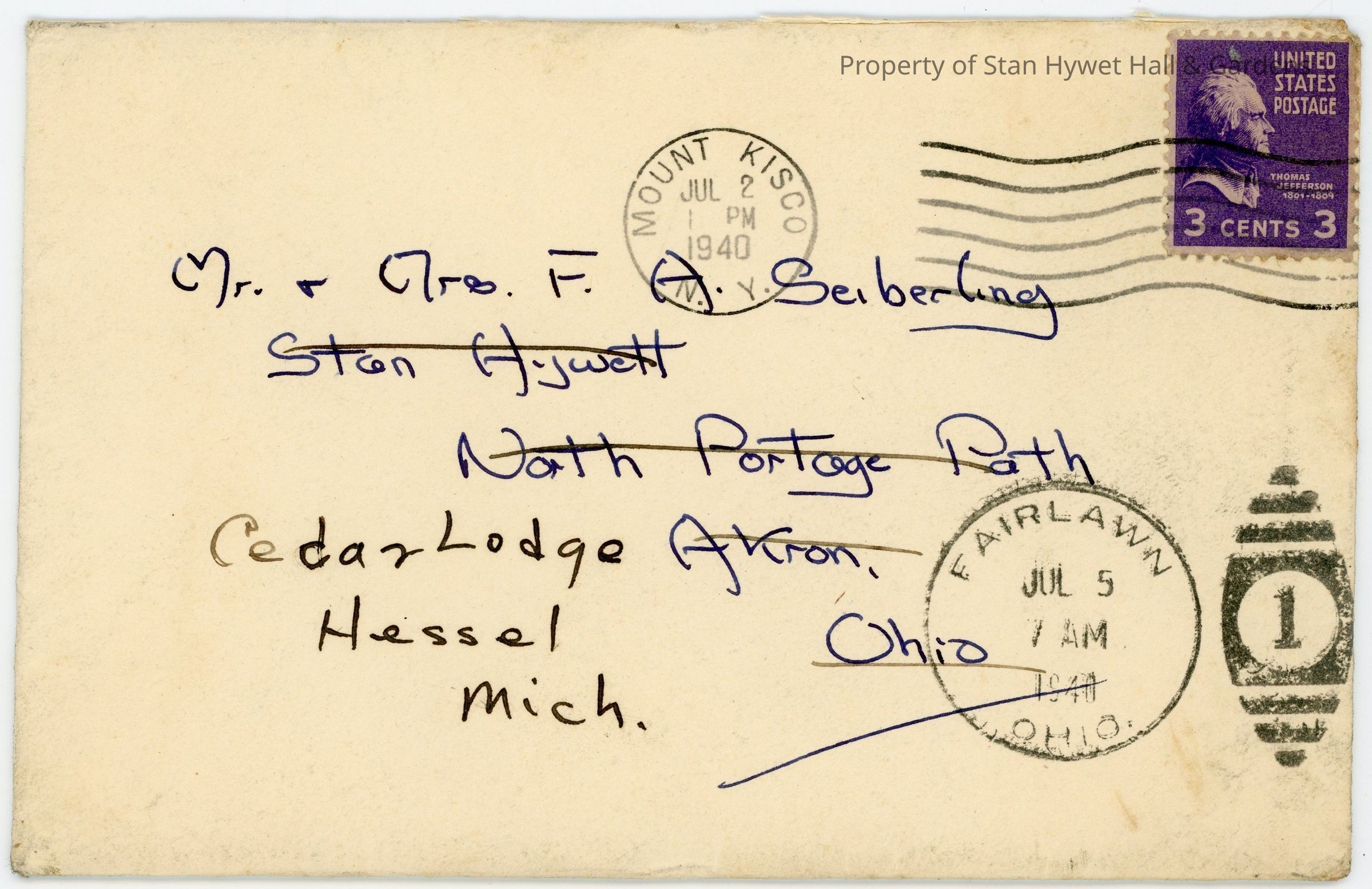 Purple 3 cent Thomas Jefferson stampAddressee