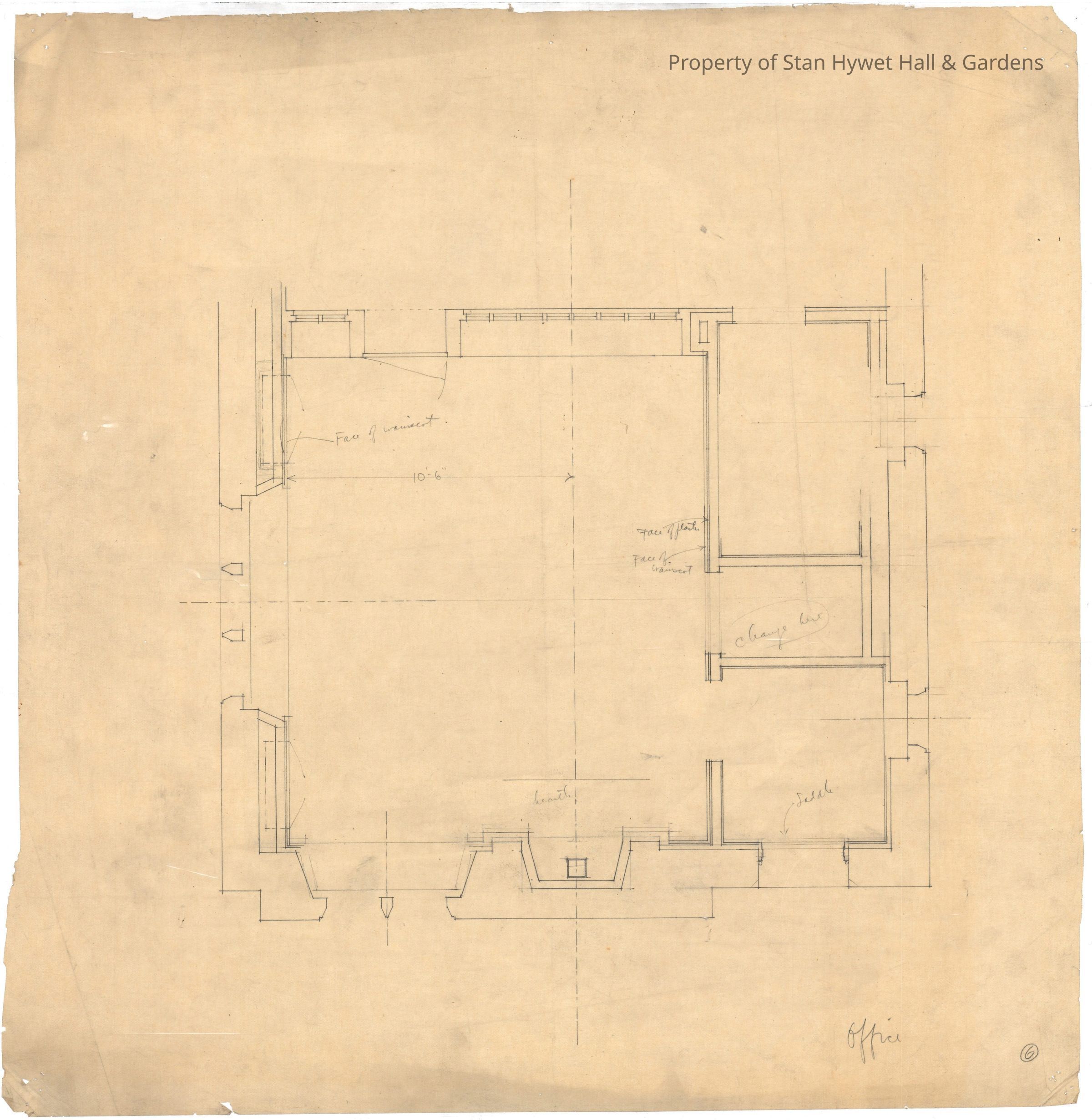 Historic drawing: Floor plan of FAS Office including the Billiard Room bathroom, closet/safe, and the vestibule.Collection
