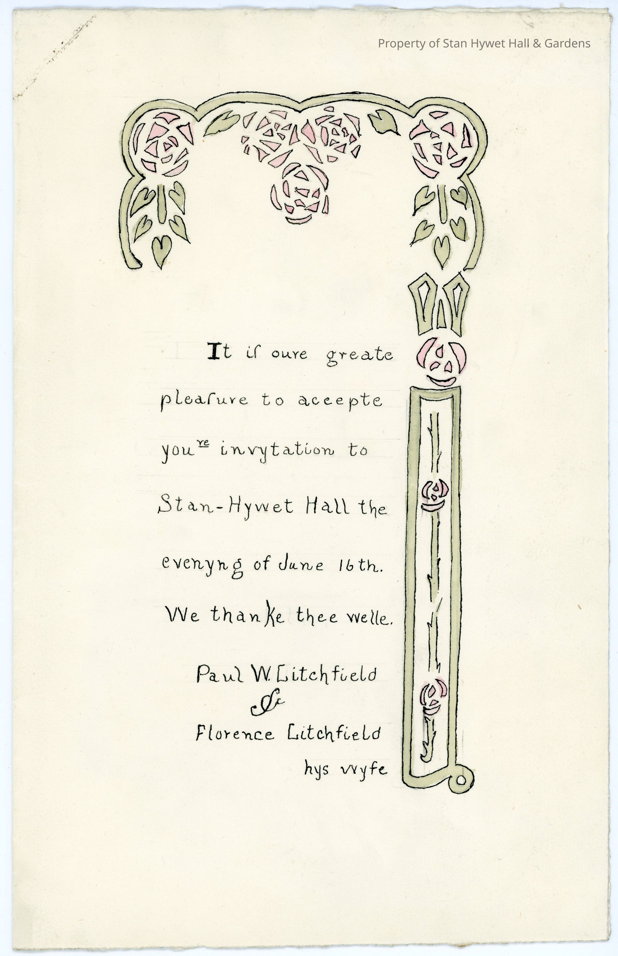 Written on heavy parchment with uncut edges, in old English style and spellings. The right side and top corner are adorned with a border inspired by the red Tudor roses on a green leafy vine from the invitation.Creator