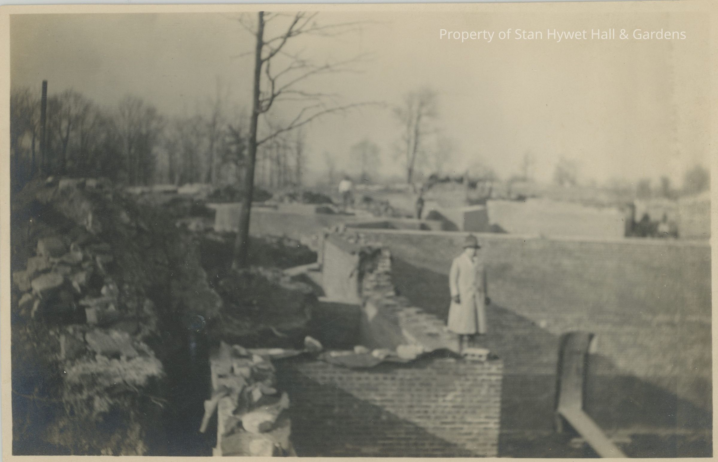 Black and white silver gelatin developed out photographic print of foundation wall construction of Manor House. Partially finished brick walls located in left foreground and background. Unidentified woman [possibly Gertrude Seiberling] located near center standing on brick wall. Second unidentified individual (possibly a workman) located in center background. Portion of debris and rock located on left of image.Photograph Details