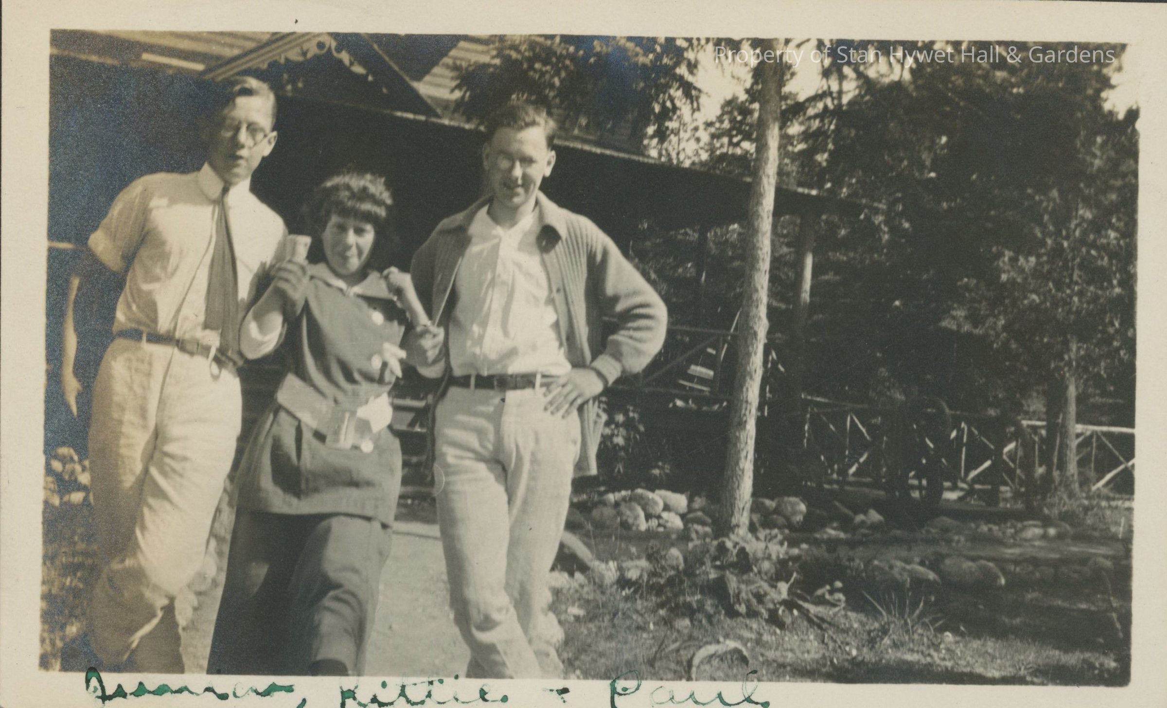 Black and white photographic print with white border. One of a series of 66 photos. Three people on walk in front of cottage at SunSands. Two young men with glasses with young woman in center. She is kicking her left leg forward and the men are holding her arms. Both men have legs crossed. She has on dark walking dress with white cuffs, collar, belt and buttons. Hand written in green ink at bottom "Junior, Kittie, & Paul". "Junior" is Charles W. Seiberling, Jr., Kittie is Kittie Seiberling FIrey, and Paul is Paul Litchfield.Photograph Details