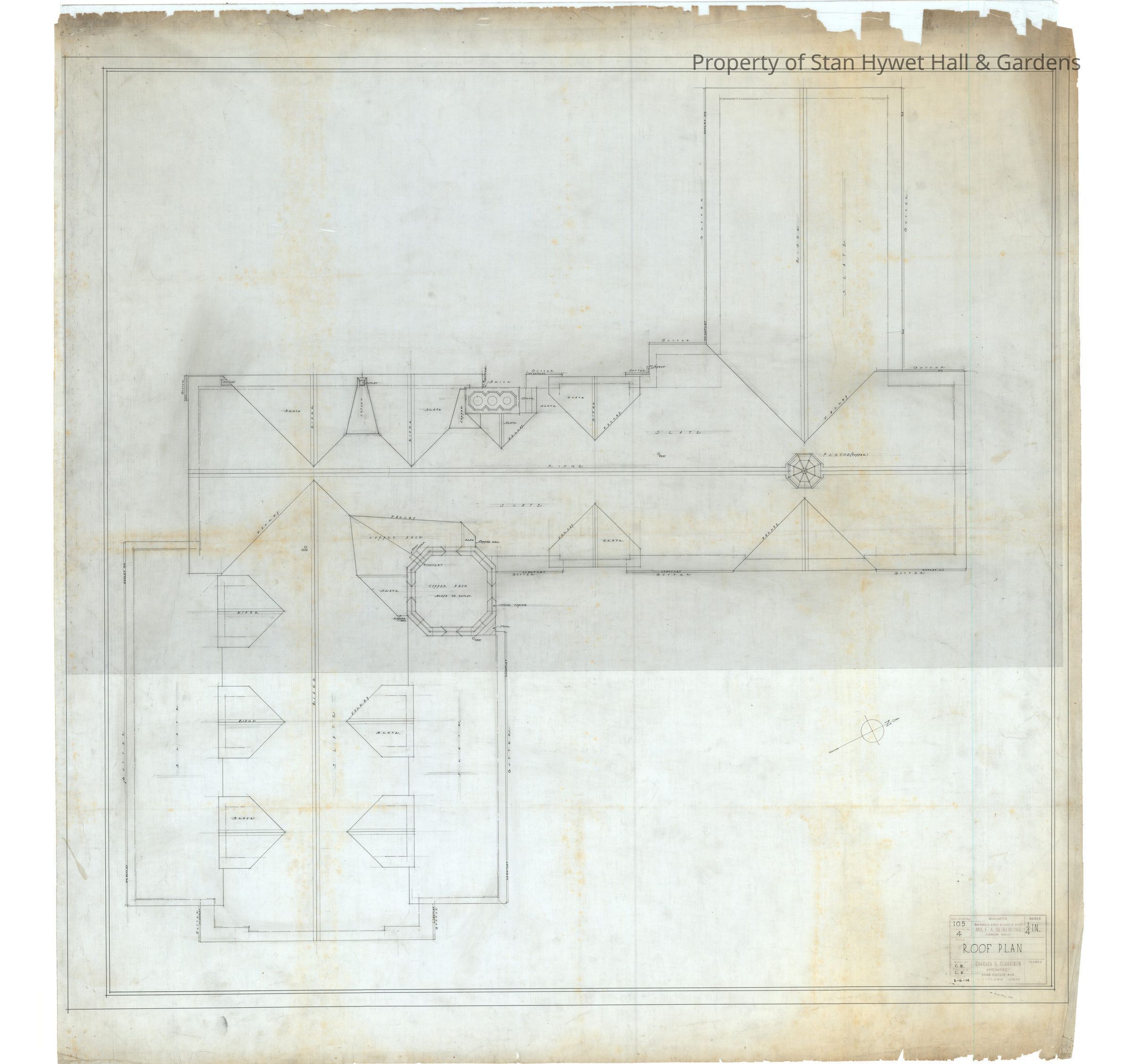 Historic drawing: Roof plan of the Carriage House on Stan Hywet estate. Titled "Roof Plan".