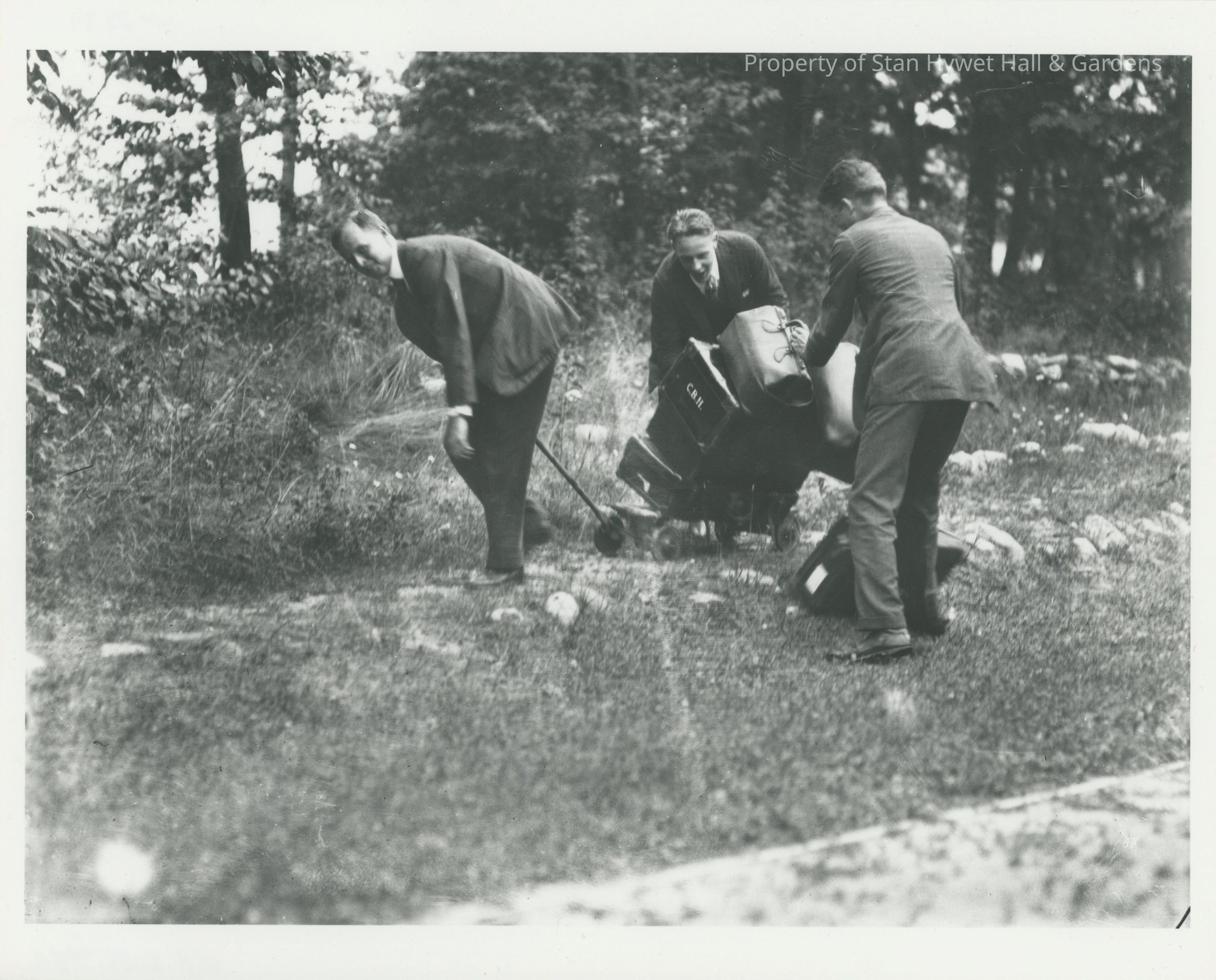 Black and white photograph of 3 young men pulling luggage on a cart along a stone lined path at Cedar Lodge. The luggage is tipping and falling to the ground.Photograph Details