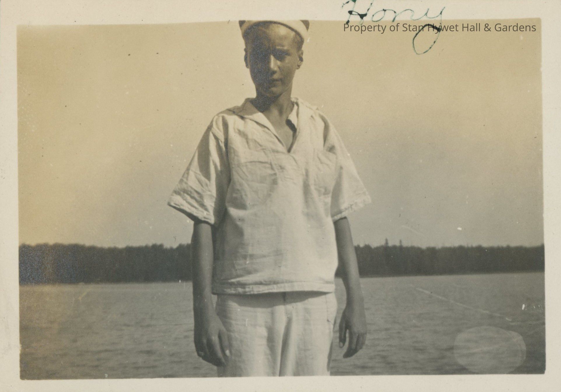 Black and white photographic print with white border. One of a series of 66 photos. Young man in wrinkled white pants, middy blouse and sailor hat. Lake in background with shore and trees. Top of head cut off by camera. Light spot at lower right corner of photograph. Hand written in green ink at top of photograph, "Hony".Photograph Details