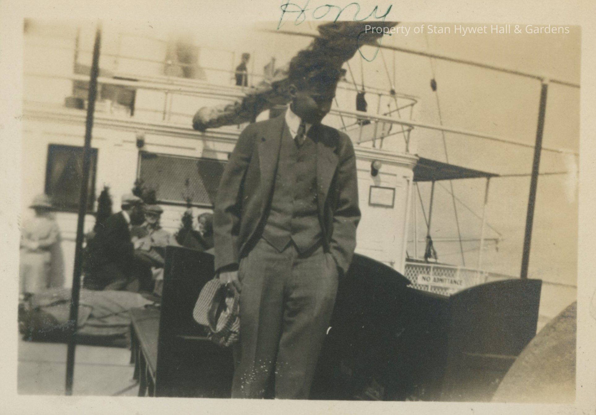 Black and white photographic print with white border. One of a series of 66 photos. Young man on board a lake steamer. He is standing at midship in a medium, dark suit, three piece, collar and tie, with a cap in right hand, left hand in pants pocket. People on upper deck standing. People on same deck behind him. He is not looking at camera but down to his left. Hand written in green ink in top border, "Hony".Photograph Details