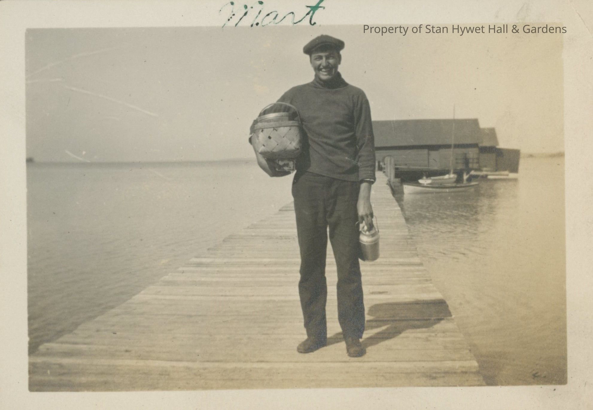 Black and white photographic print with white border. One of a series of 66 photos. At top written in green ink, "Mart." Man standing on a wooden dock with a boathouse and boats in background. Man has on dark pants, turtle neck and cap and is smiling. Has a metal container in left hand. Basket with metal container under right arm.Photograph Details