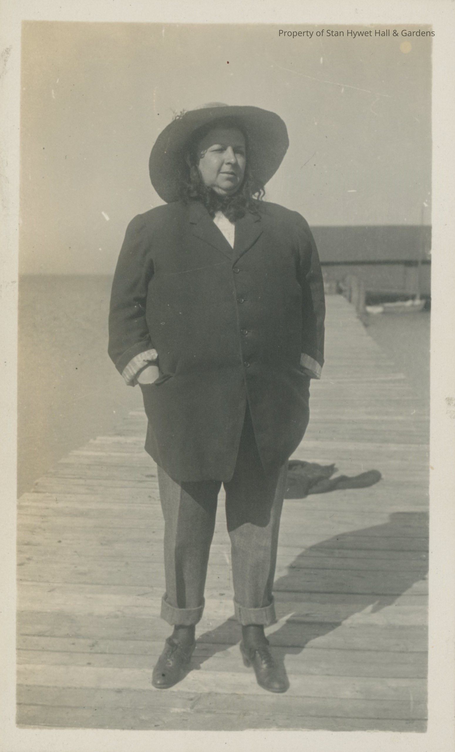 Black and white photographic print with white border. One of a series of 66 photos. Mrs. Frances Seiberling (Joseph Laffer Seiberling) standing on wooden dock with boathouse in background. She is in costume of mens clothing with artificial beard, large hat. Dark jacket, cuffs turned up front. Lighter trousers rolled at cuffs. Dark hose and dark tie shoes with light heel. She has both hands in pockets.Photograph Details