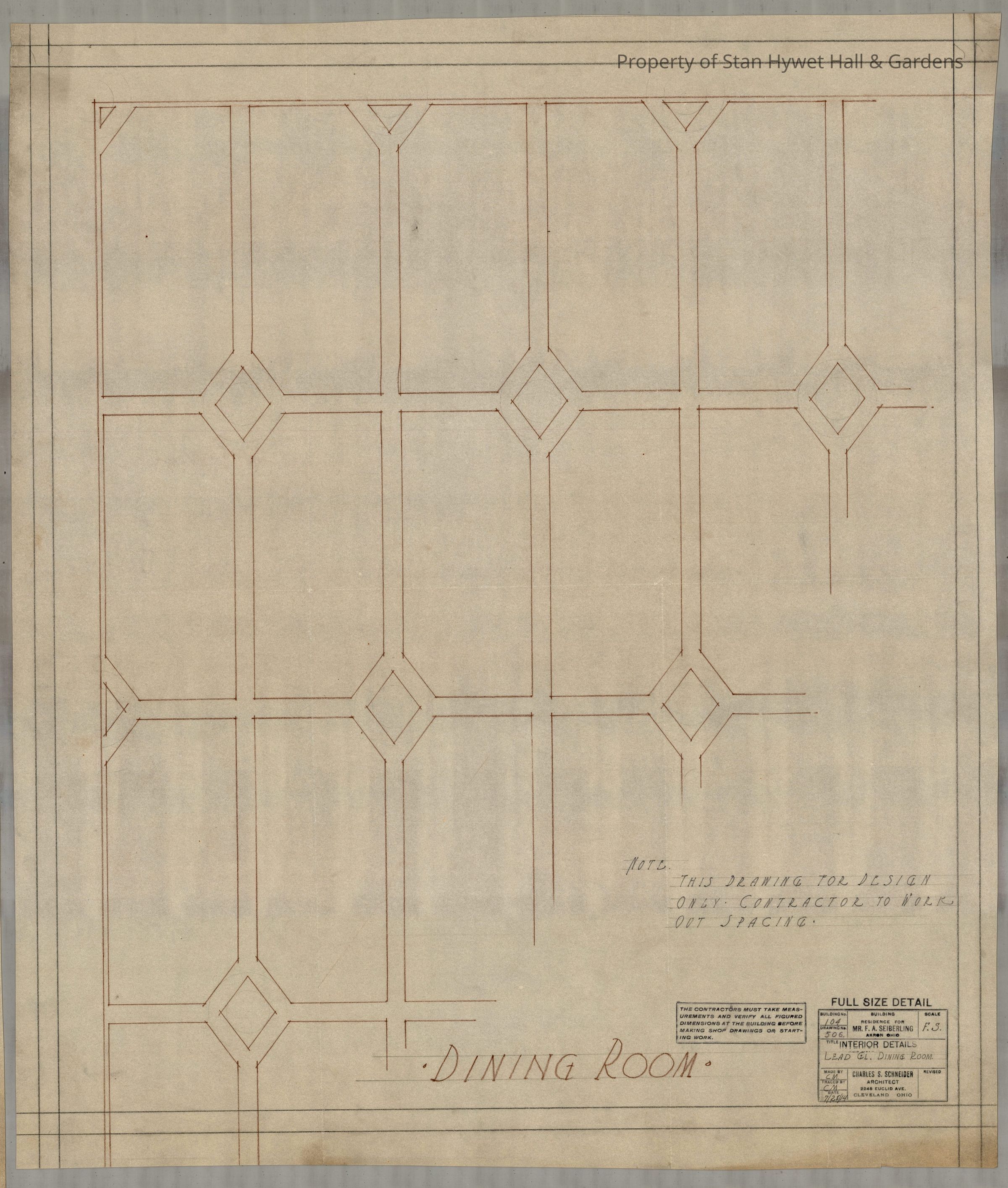 Historic Drawing: Concept drawing of leaded glass window pattern for the Dining Room. This pattern was not used. Titled "Interior Details Lead GL. Dining Room".