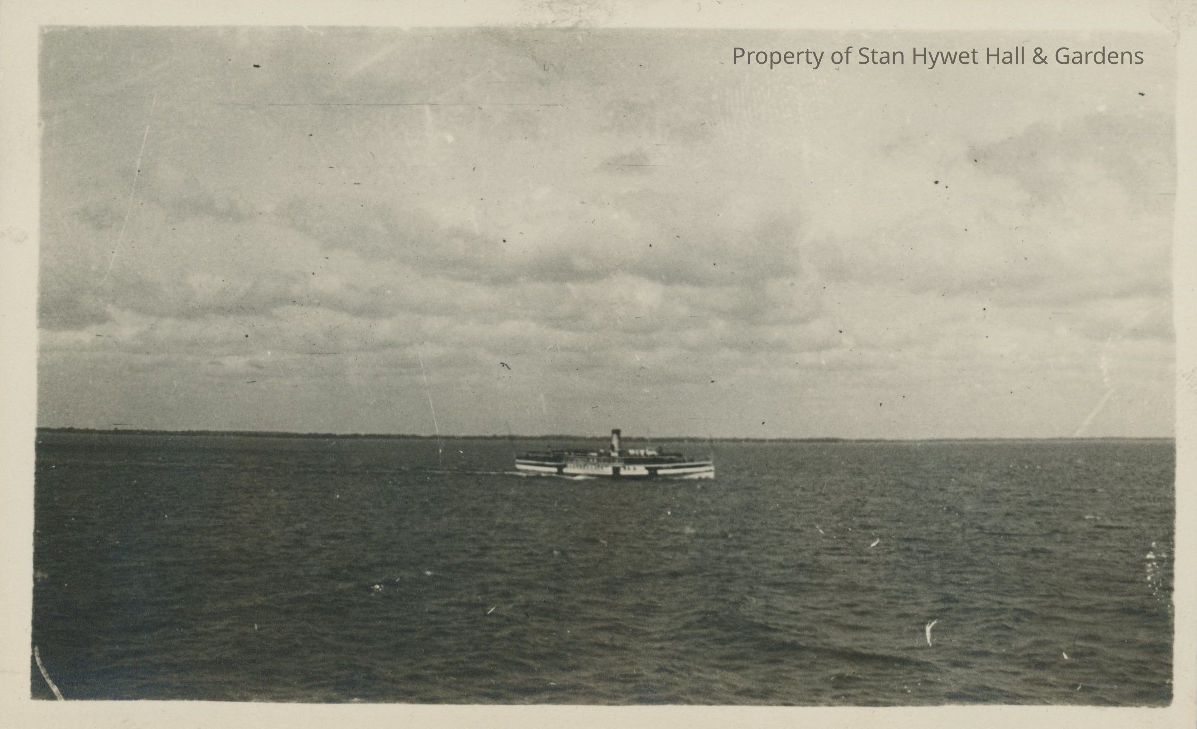 Black and white photographic print with white border. One of a series of 66 photos. Small lake steamer with dark horizontal lines and three dark squares on the side. One smoke stack, could be laundry hanging on a line top deck forward. Water looks choppy. White marks on dark lake surface. Shoreline visible on horizon. A lot of dark spots on surface of photo.Photograph Details