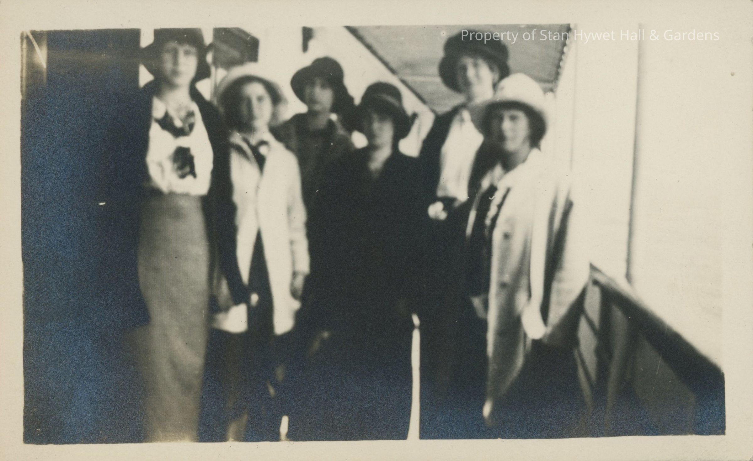 Black and white photographic print with white border. One of a series of 66 photos. Six young ladies standing on deck of ship from bulkhead to railing, two very tall. All have on hats and jackets. Lillian second from right, Dode third from left, Kittie sixth from left (as identified from other photos). Photo is out of focus.Photograph Details