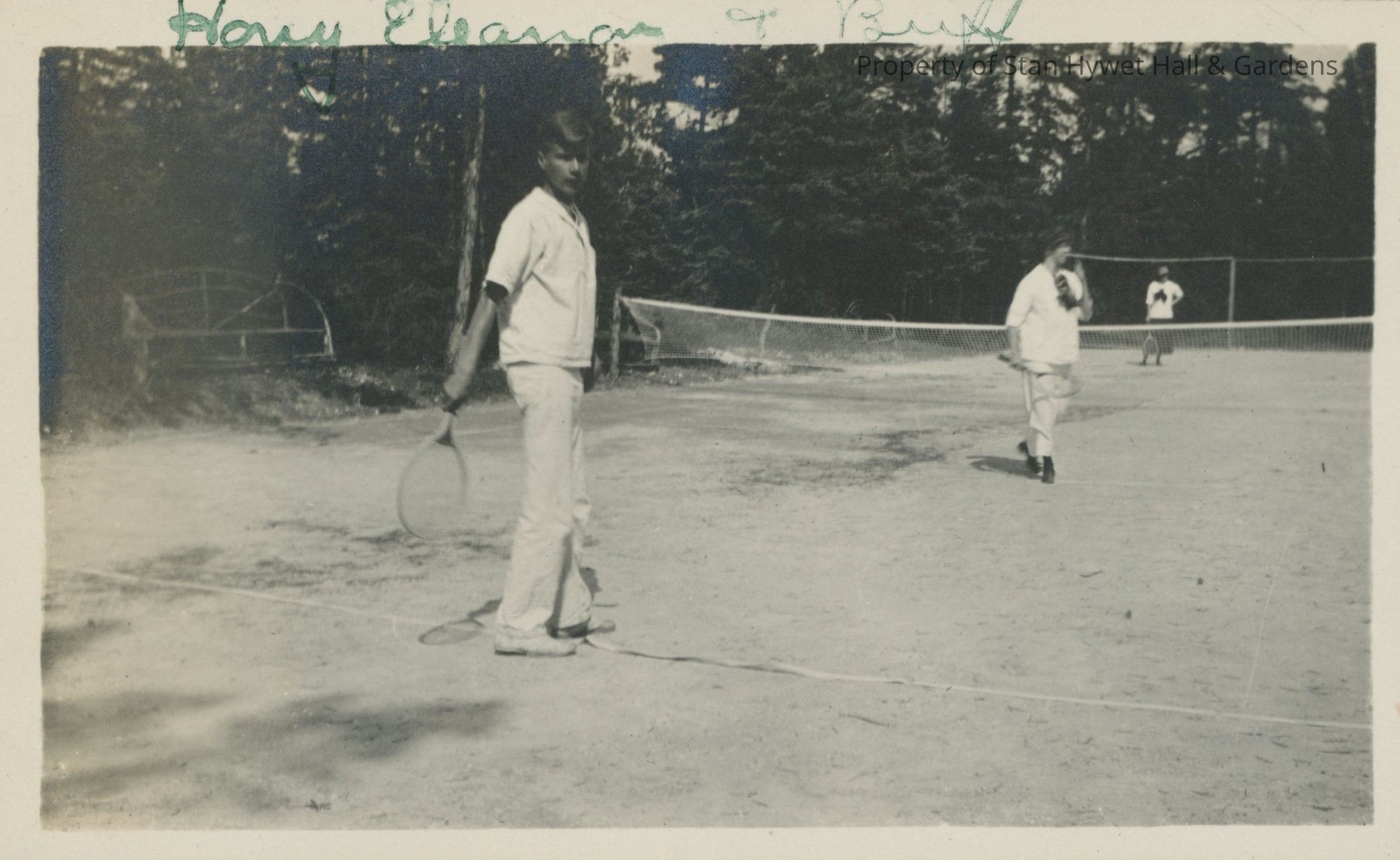 Black and white photographic print with white border. One of a series of 66 photos. A man and two women on the tennis court at Cedar Lodge. Hand written in green ink at top edge of photograph, "Hony, Eleanor and Buff". Hony is in the foreground with tennis racquet. Eleanor is close to the net, walking toward camera. Buff is in background with left hand on hip. Bentwood bench at left under trees. Tennis lines look like loose pieces of tape.Photograph Details