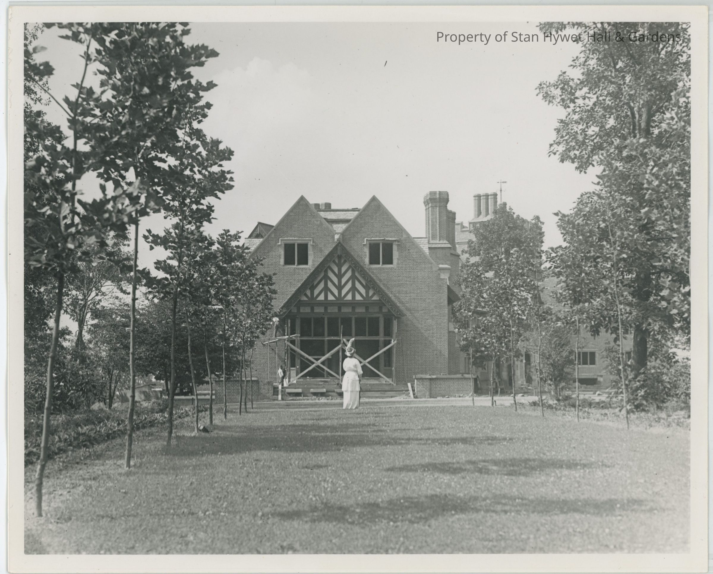 Black and white photographic print. Has been reproduced from a negative. Photograph is of the South Terrace and London Plane of the manor house when it was under construction in 1914. No window glass is present in the stone mullion frames on the upper level of the house. Gertrude Seiberling is in center of photograph wearing an elbow length sleeve dress and a brimmed hat containing a plume. Gertrude is overlooking construction. Gertrude Seiberling is faced toward the South Terrace (her back is to the photographer). A row of trees line each side of the South Terrace.Photograph Details