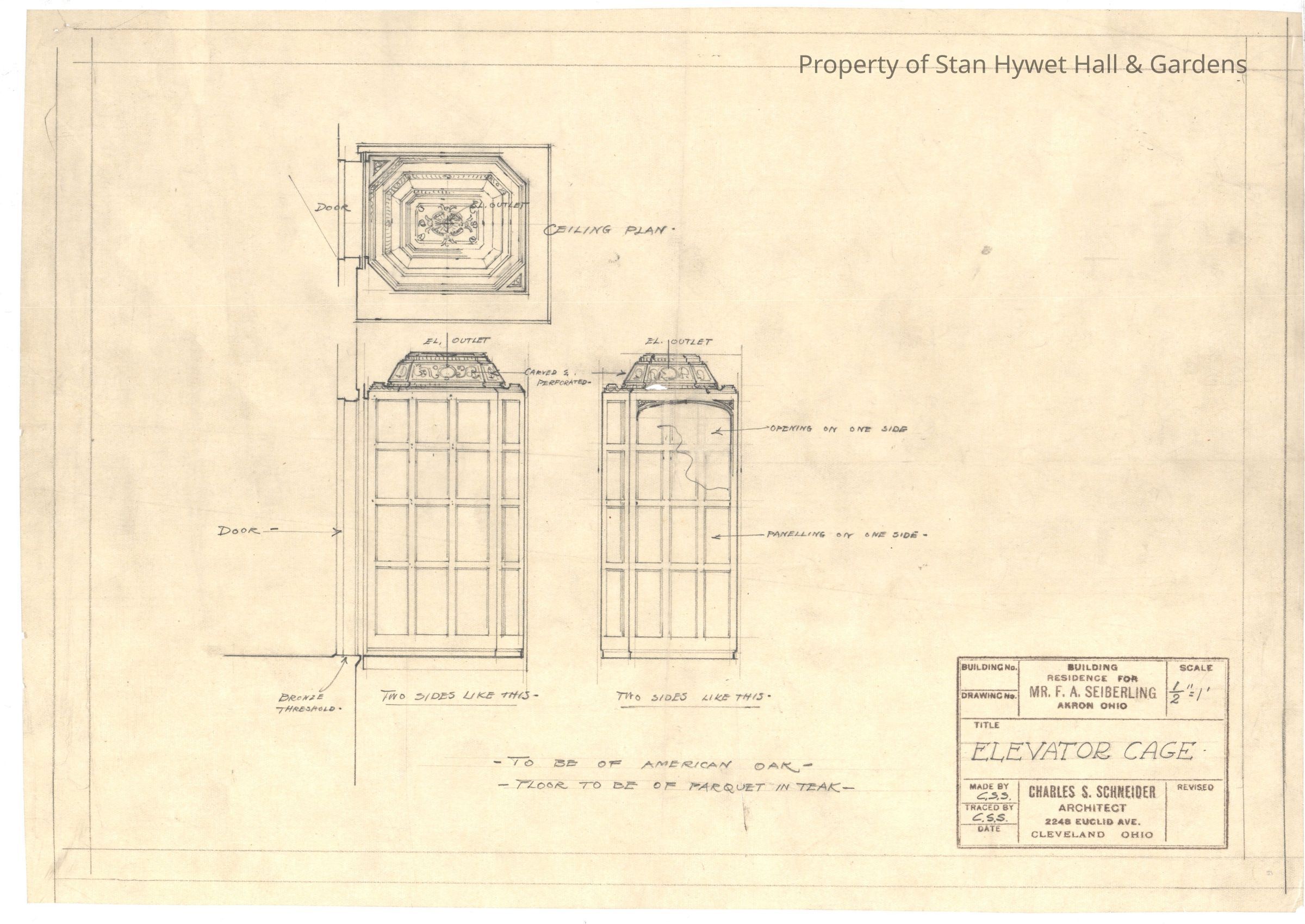 Historic drawing: Plans of the Elevator Cage for the Passenger Elevator in Stan Hywet Hall; includes the ceiling and wall plans of the cage. Titled "Elevator Cage".