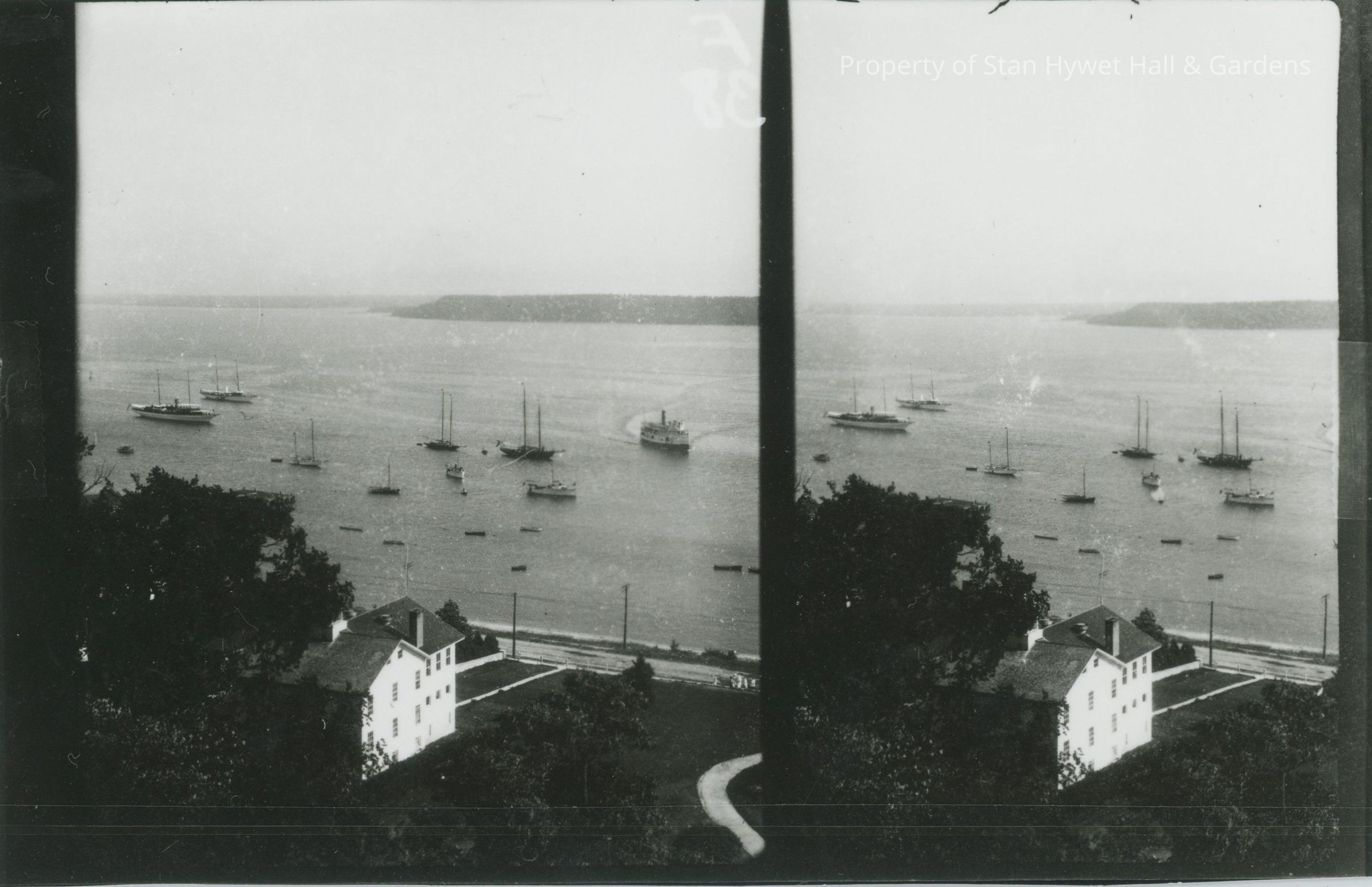 Black and white silver gelatin developed out photographic print of the harbor area of Mackinac Island, Michigan. Processed as a stereo view with double image. View taken from above harbor area looking down into harbor. Large, white building located in foreground. Several trees visible along lower left section of image. Body of water located in background with several small and large boats. Portion of land visible in background.Photograph Details