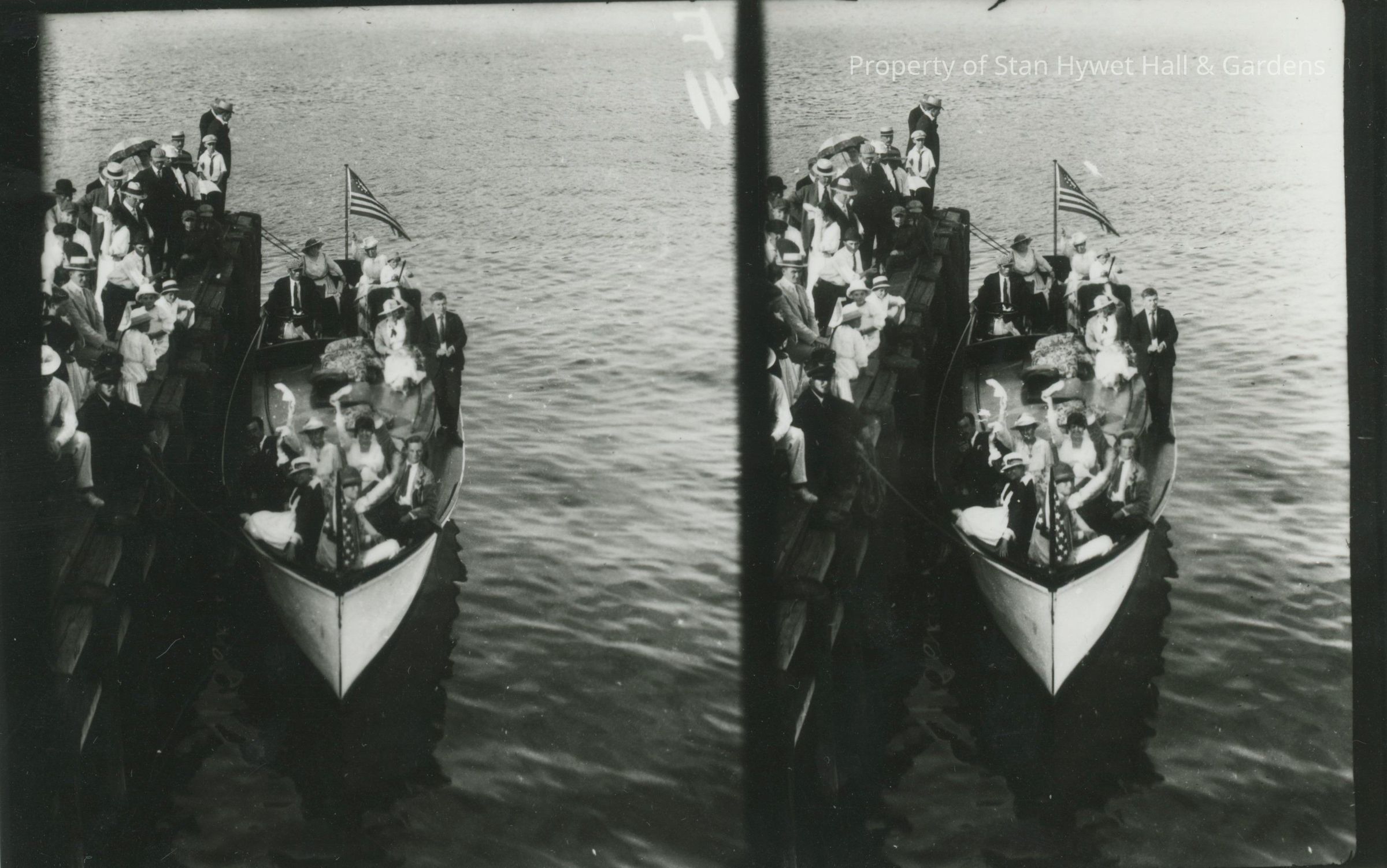 Black and white silver gelatin developed out photographic print of dock area attributed to Mackinac Island, Michigan with large motor boat and group of people. Processed as a stereo view with double image. View taken slightly above dock and boat facing down on dock area. Four unidentified males, seven females and one boy [estimated to be Franklin Seiberling, Jr.] located within boat. Many men and boys standing along dock area facing boat. Body of water in background and to left of image. Several of the individuals located within the boat are likely Seiberlings and are evident in SHH 97.901.2-.3 as well.Photograph Details