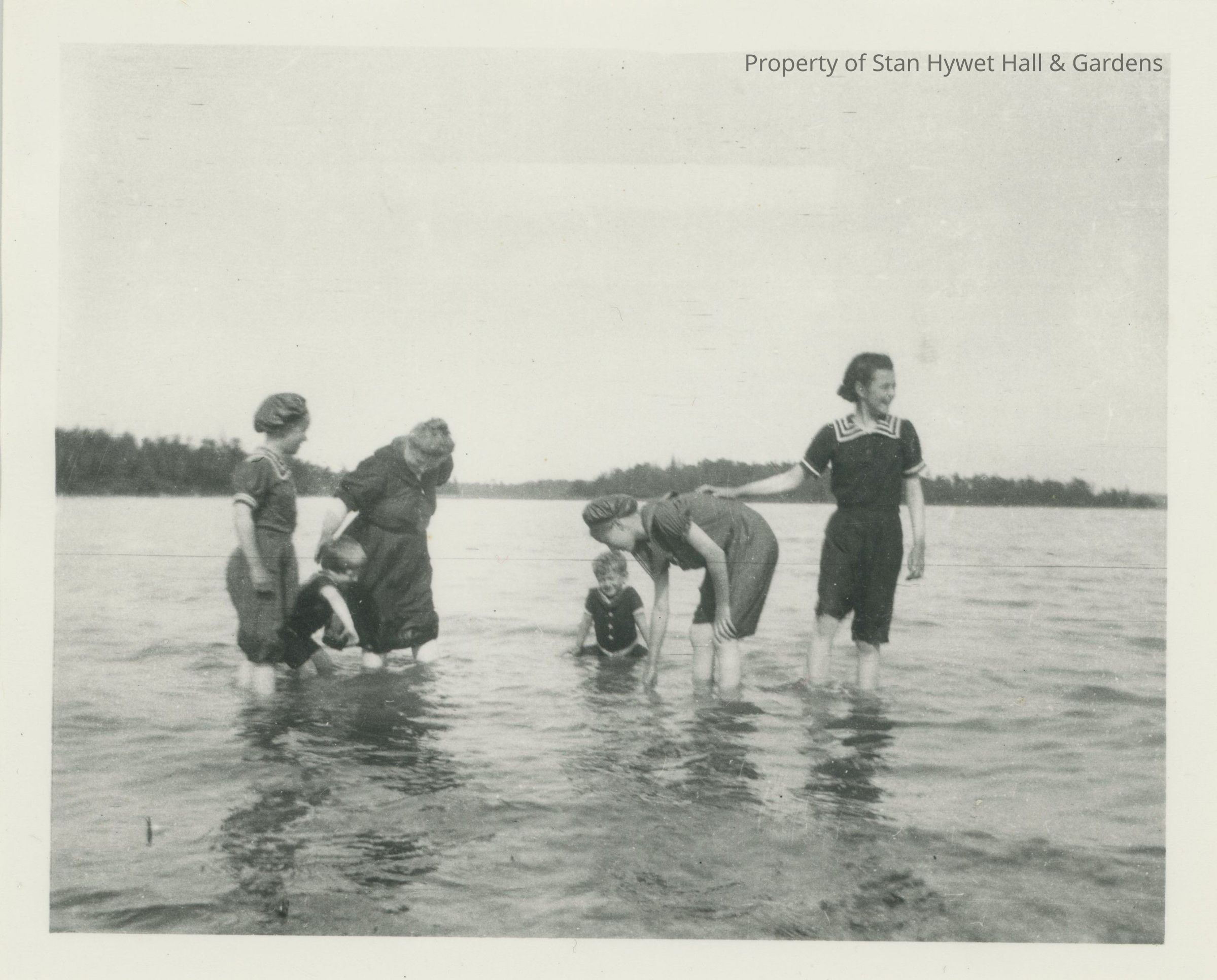 Black and white photograph print with 1/4" white border. View of four women and two children in bathing costumes up to the women's mid calves in lake water. The children are playing in the water with the women looking on and smiling. One of the women is bent over with her hand in the water, a second women has her had on this woman's back as if to steady herself. The two women on left appear to be Irene and Gertrude.Photograph Details