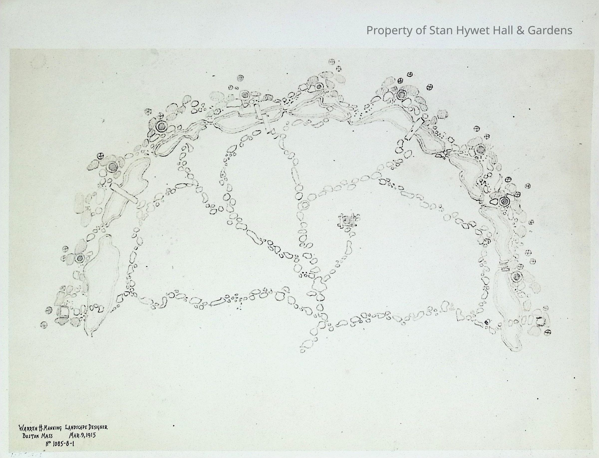 Pencil drawing mapping out the layout of the Japanese garden paths. On the bottom left written in pen: